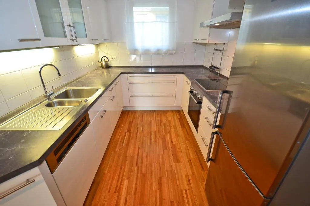 Die offene Küche ist mit einer hochwertigen Einbauküche ausgestattet. Die Einbauküche beinhaltet einen Herd mit Dunstabzug nach außen, einen Backofen, eine Spülmaschine, einen Kühlschrank mit Gefrierfach sowie Ober- und Unterschränke.