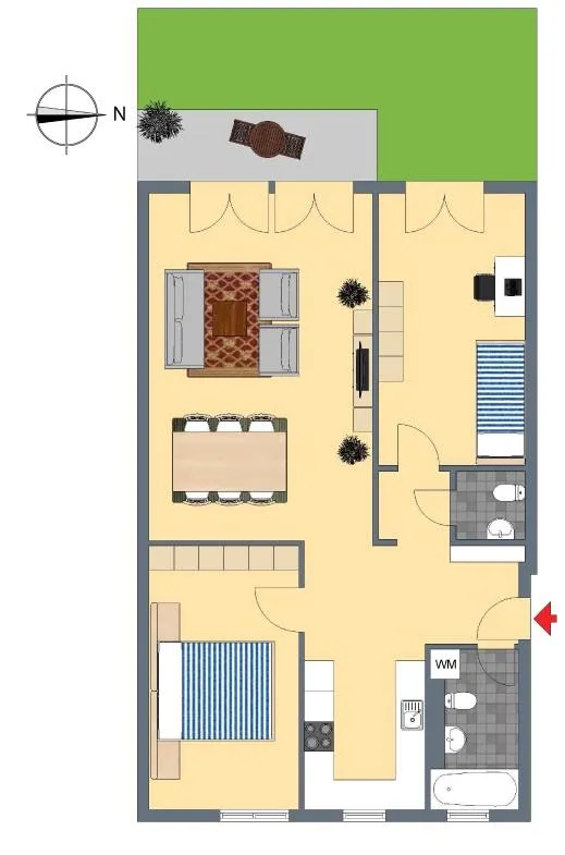 Die Aufteilung der Wohnung ist sehr gut. Alle Räume sowie die offene Küche und der offene Wohn-/Essbereich sind von der Diele aus begehbar. Die ca. 12 m² große West-Terrasse ist überdacht und vom Wohnbereich zugänglich.