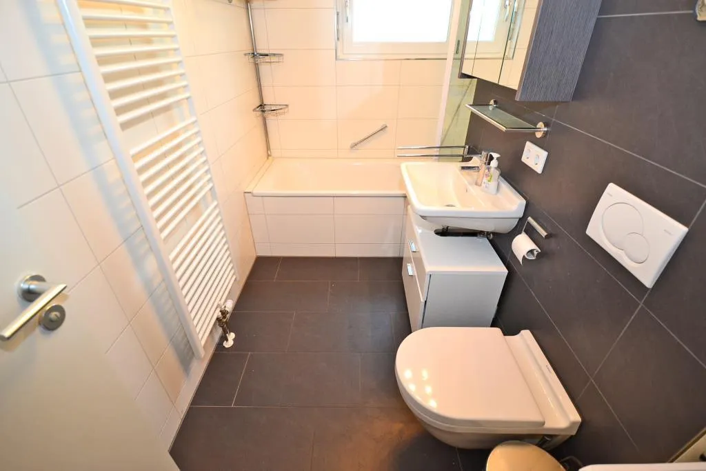 Das Badezimmer mit Fenster ist raumhoch weiß gefliest und mit einer Badewanne, einem Waschbecken, einer Waschmaschine, einem Handtuch-Heizkörper, sowie einem WC ausgestattet. Ein zweites WC ist separat und gefliest.