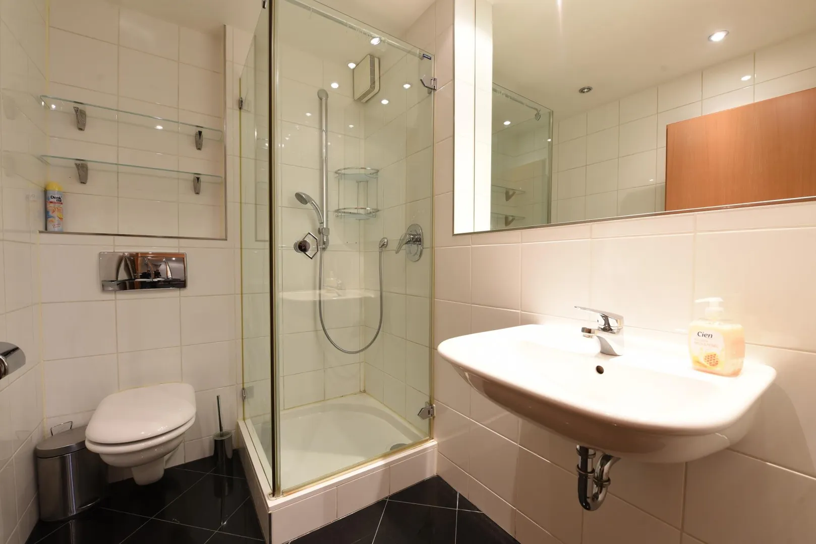 Die Wohnung verfügt über zwei Bäder. Das größere Badezimmer ist mit einer Eck-Badewanne, einem Waschbecken, einem WC sowie einem Handtuchheizkörper ausgestattet. Das kleinere Badezimmer verfügt über eine Dusche, ein Waschbecken, ein WC sowie einen Handtuchheizkörper.