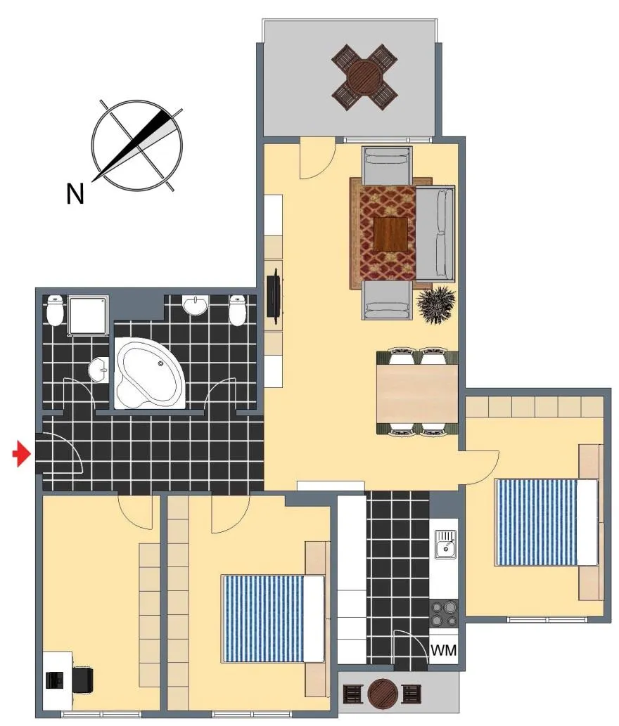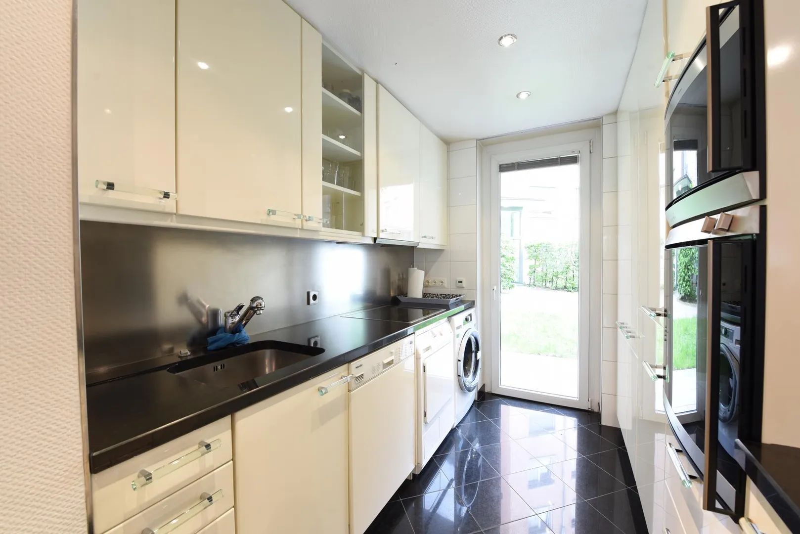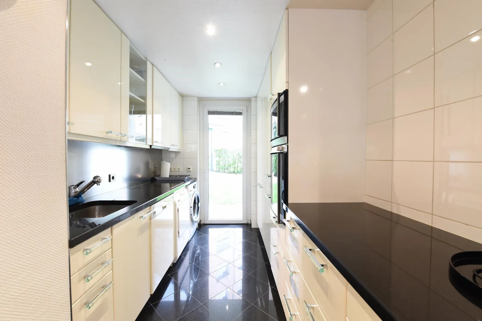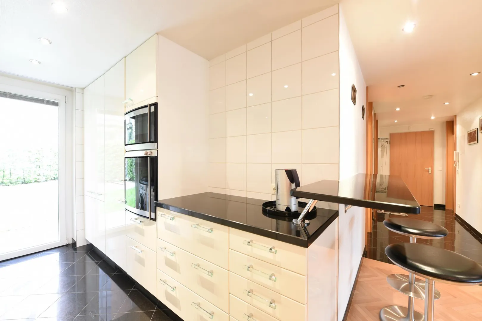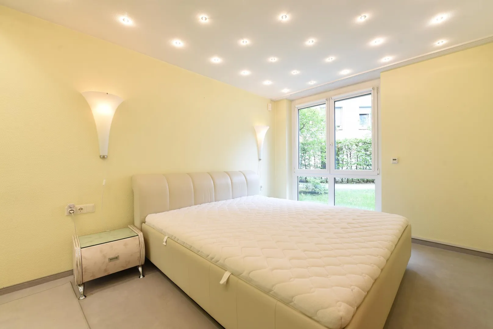 Diese möblierte (bei Bedarf nicht möblierte) und hochwertig ausgestattete 4-Zimmer-Wohnung befindet sich im Erdgeschoss (mit Balkon).