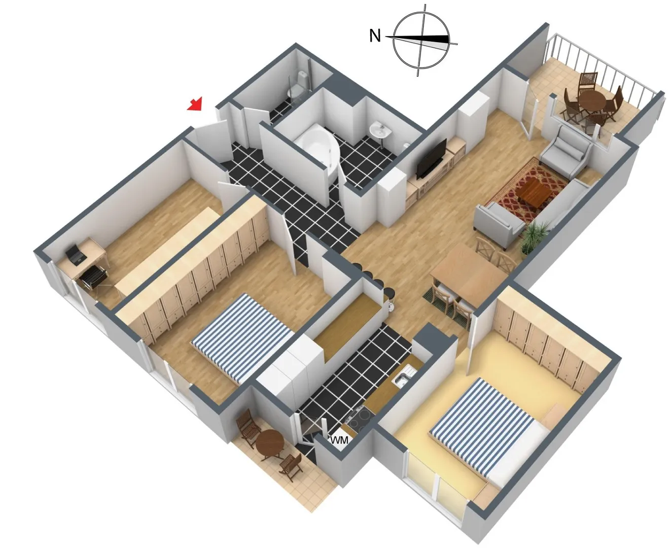Der Wohn-/Essbereich ist nach Südosten ausgerichtet. Die offene Küche, das Schlafzimmer, das Gästezimmer sowie das Arbeitszimmer sind nach Nordwesten ausgerichtet.
