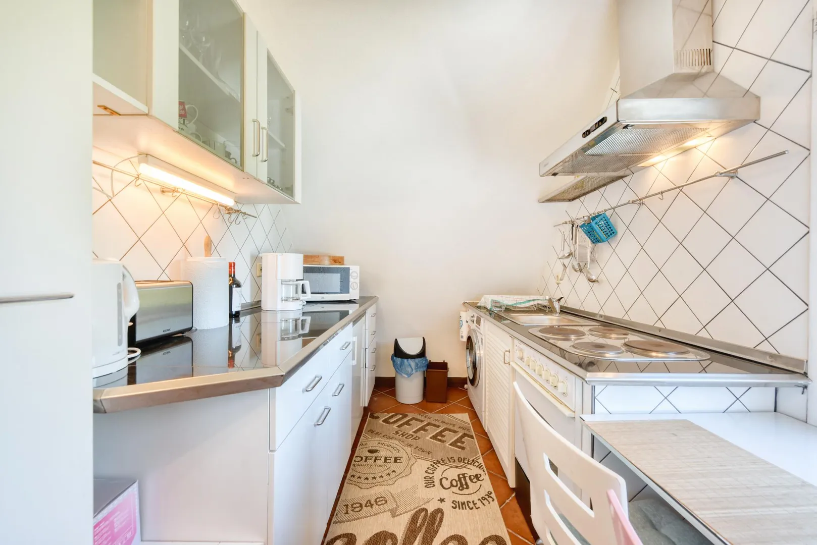 Die Küche ist mit einer Einbauküche ausgestattet. Die Einbauküche verfügt über einen Kühlschrank mit Gefrierfach, einen Herd, einen Backofen mit Dunstabzug nach Außen, eine Mikrowelle, eine Waschmaschine/Trockner (Kombi-Gerät) sowie Ober- und Unterschränke. Eine Spülmaschine ist nicht vorhanden.