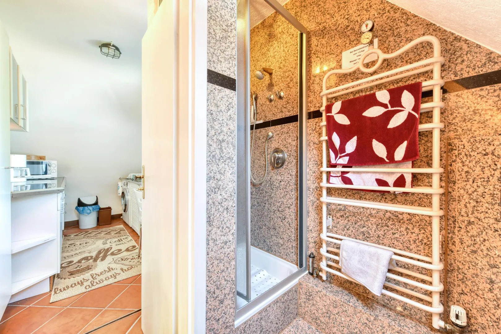 Das raumhoch geflieste Tageslicht-Badezimmer verfügt über eine Dusche, ein WC sowie einen Handtuch-Heizkörper.