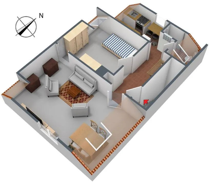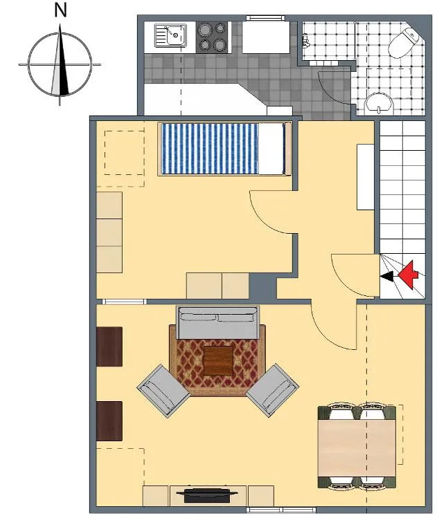 Alle Räume sind vom Flur aus begehbar. Das Badezimmer verfügt über ein Fenster. Eine Abstellfläche auf der Bühne ist über eine Leiter im Schlafzimmer begehbar.