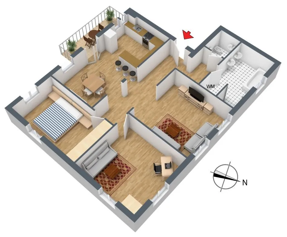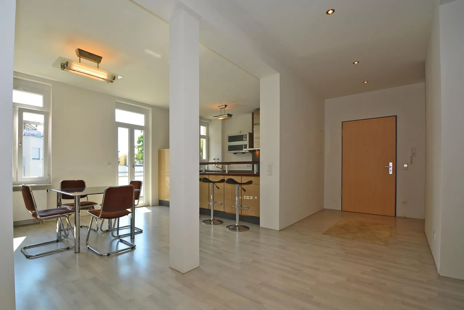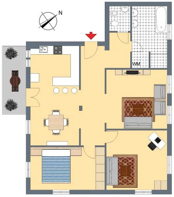 Die Raumaufteilung der Wohnung ist offen. Der Flur-, Wohn-, Ess- und Küchenbereich ist offen. Über den Flur geht es zum Bad mit Fenster sowie zum separaten WC mit Bidet. Über den Wohn-, Essbereich geht es zu zwei abgeschlossenen Zimmern.