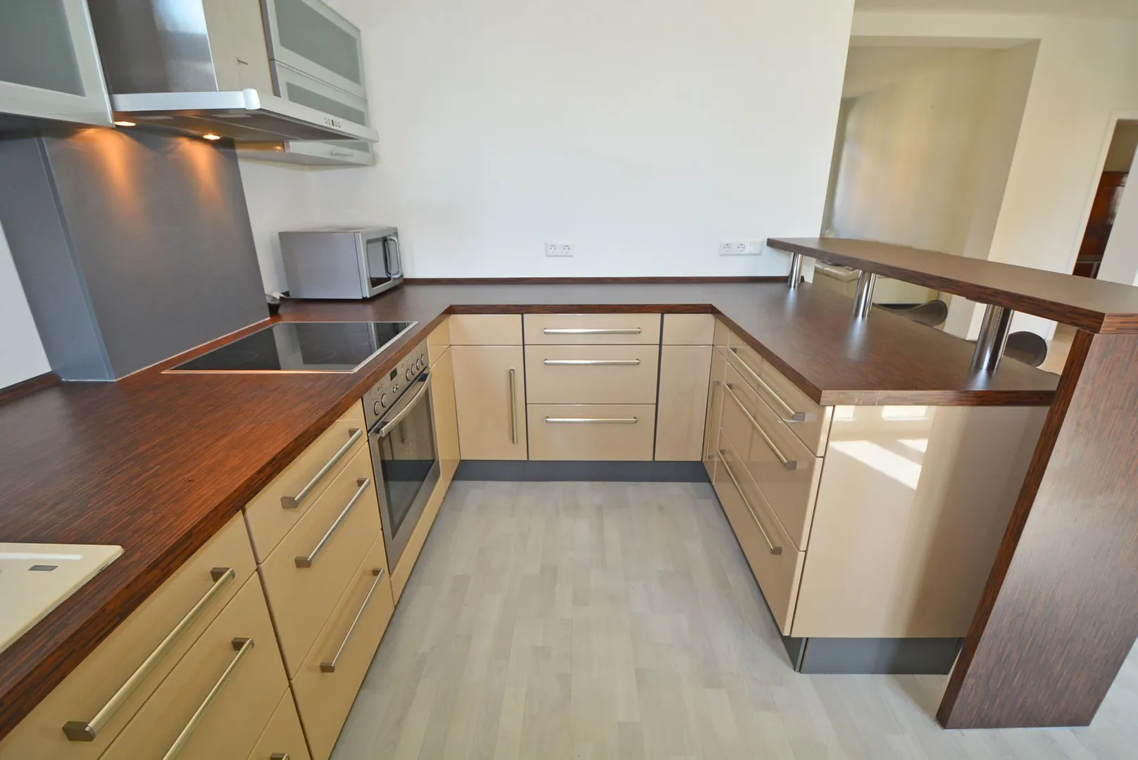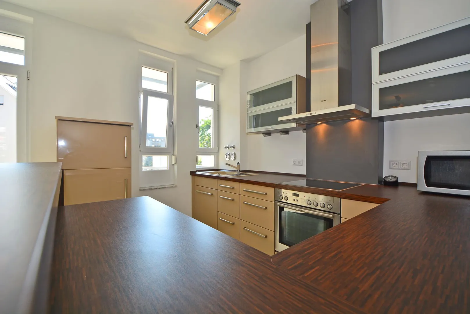 Die offene Küche ist mit einer Einbauküche mit Theke ausgestattet. Die Einbauküche mit Moccacreme-Hochglanzfronten beinhaltet einen Ceran-Herd, einen Backofen, eine Dunstabzugshaube, einen Kühlschrank mit Gefrierschrank sowie Unter- und Oberschränke.