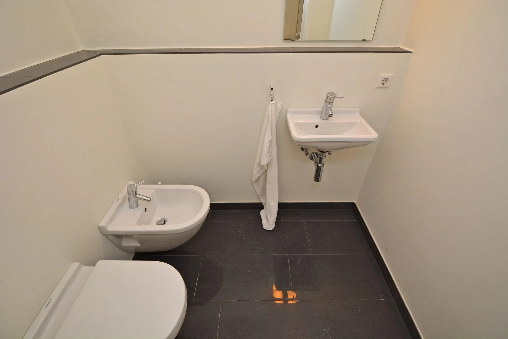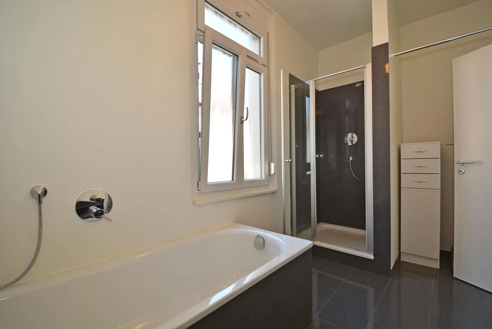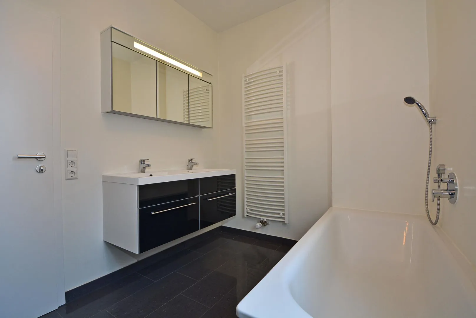 Das Tageslicht-Badezimmer ist ausgestattet mit einer Badewanne, einer Dusche, Doppelwaschbecken mit Unterschränken sowie mit einem Spiegelschrank, einem Waschmaschinenanschluss sowie einem Handtuch-Heizkörper. Eine Waschmaschine ist nicht vorhanden.