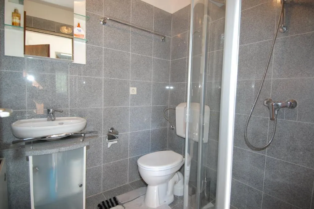Der Flur ist mit Granit-Platten gefliest. Das Badezimmer verfügt über ein Fenster. Es ist mit Granit-Platten gefliest, mit einer Dusche und einem WC ausgestattet.