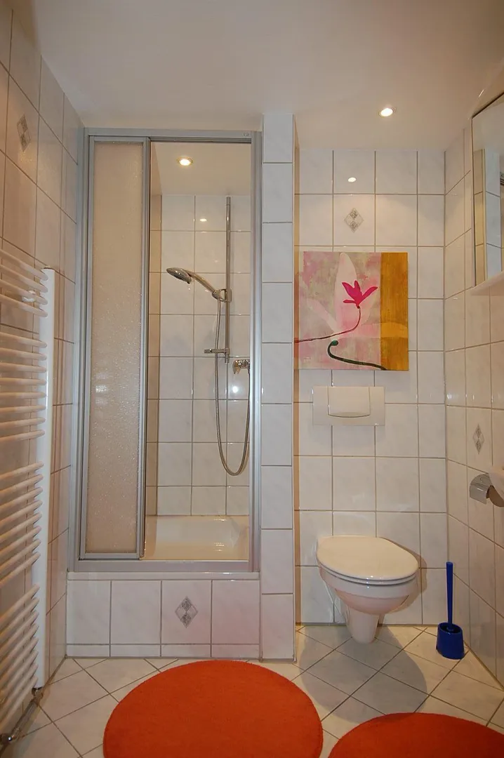 Das innenliegende, schicke Badezimmer ist komplett raumhoch gefliest. Es ist mit einer Dusche, einem WC, einen Handtuchheizkörper und einem Spiegelschrank ausgestattet. Die Decke ist abgehängt und mit Halogenlampen ausgestattet.