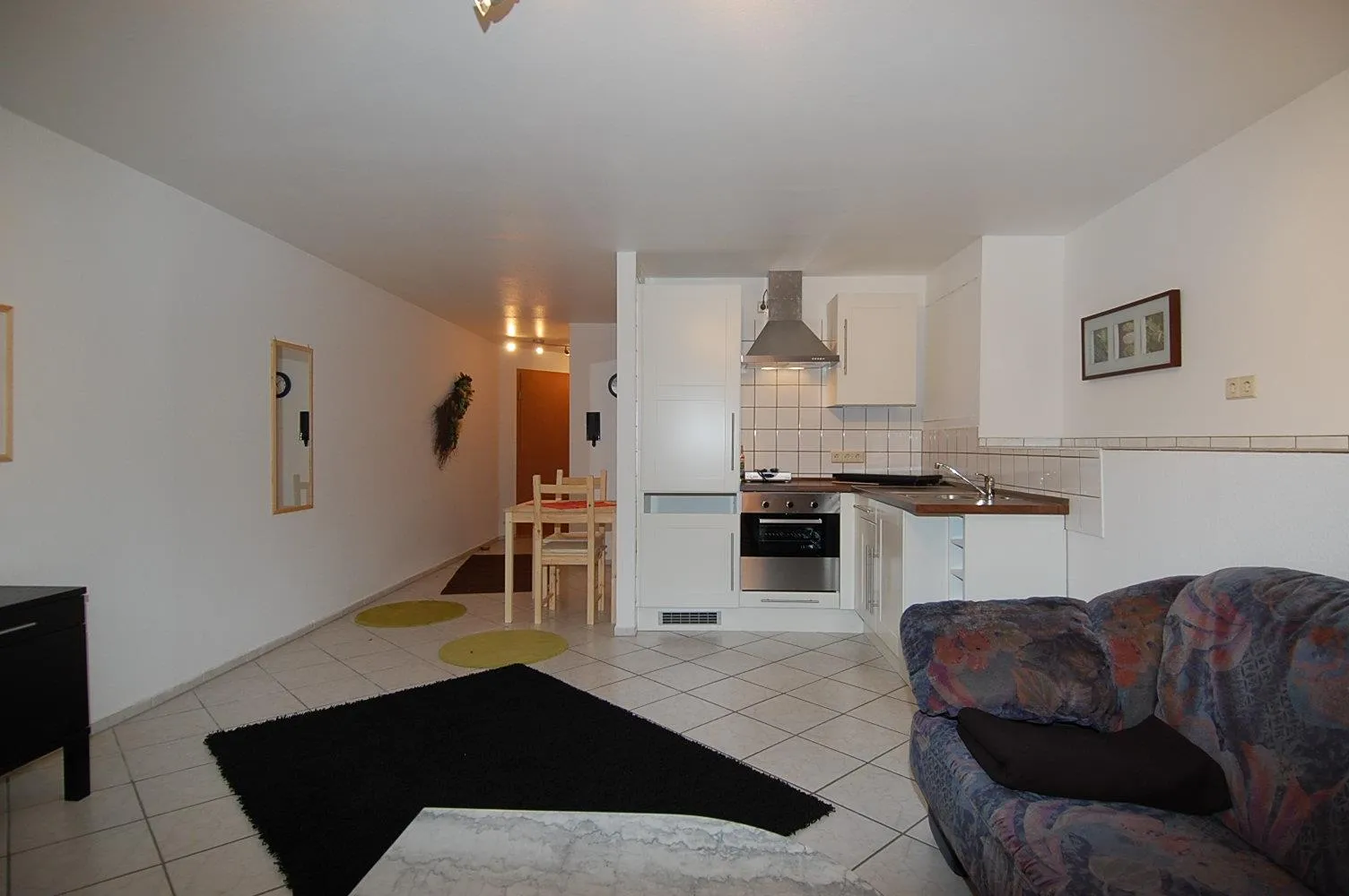 Diese schöne 2 Zimmer-Wohnung mit einer offenen Kochecke ist komplett mit hellen weißen Fliesen ausgestattet.
