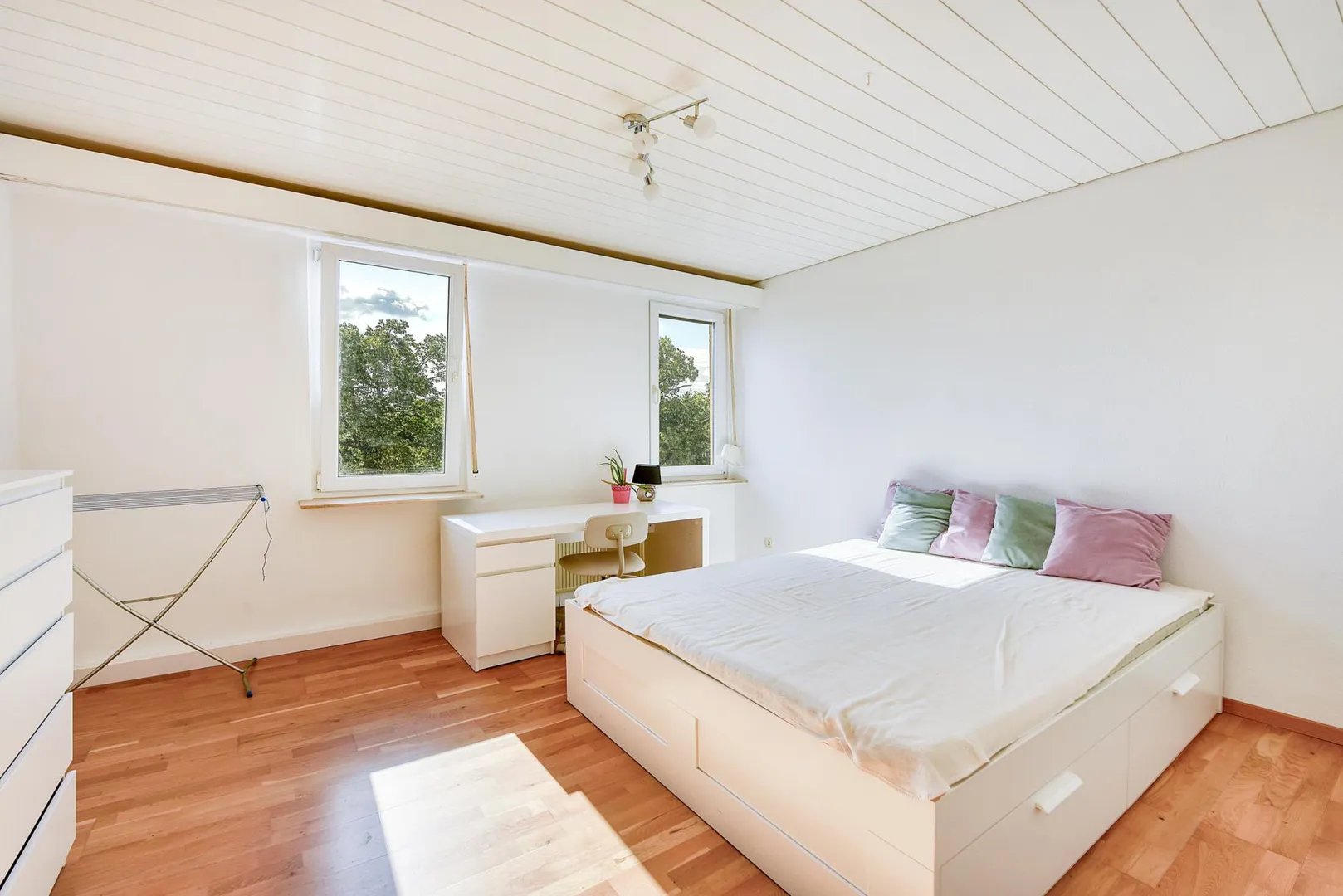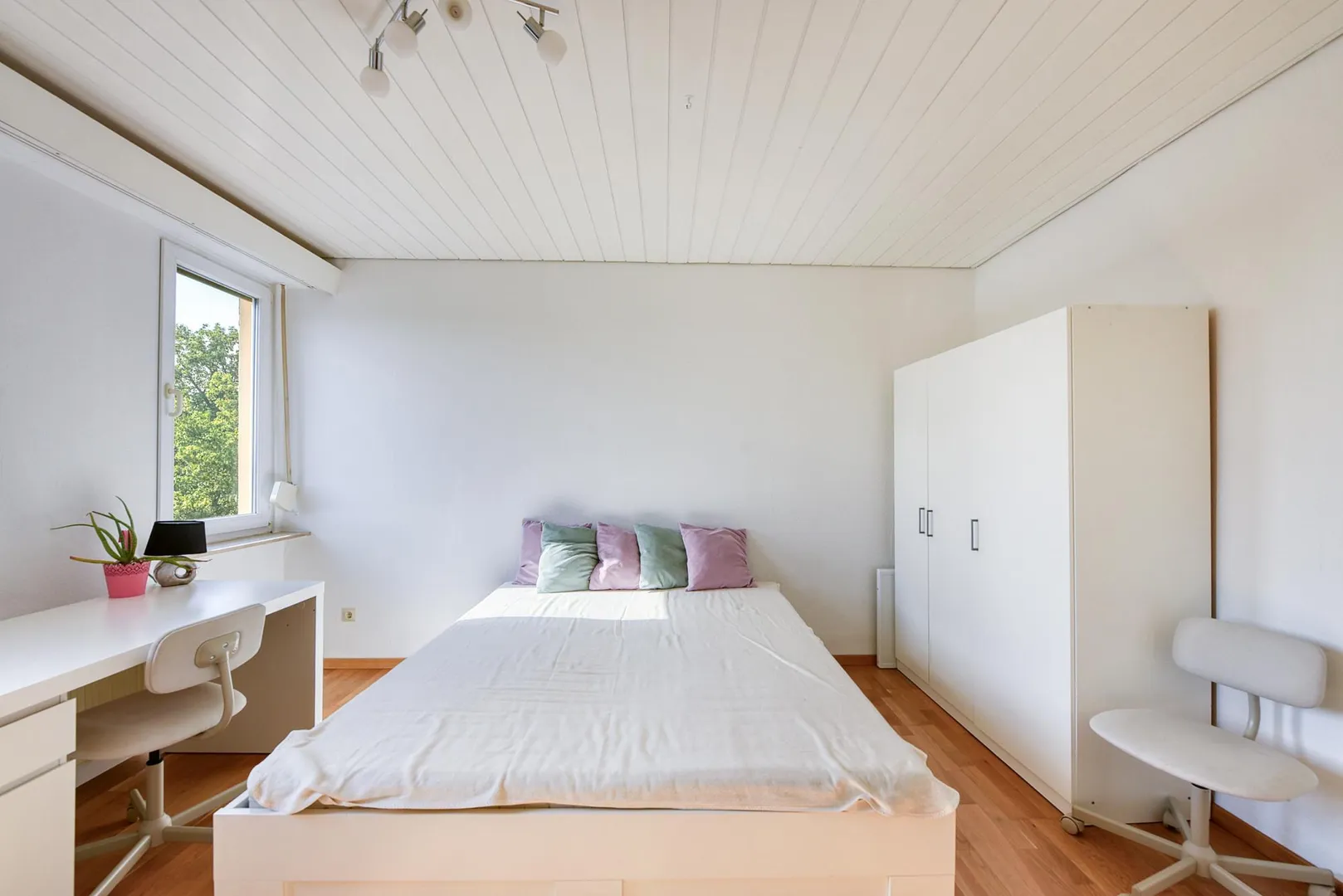 Das Zimmer ist möbliert mit einem 160 cm breitem Bett, einem 140 cm breitem Schrank, einem Schreibtisch mit Stuhl sowie einer Kommode mit Schubladen.