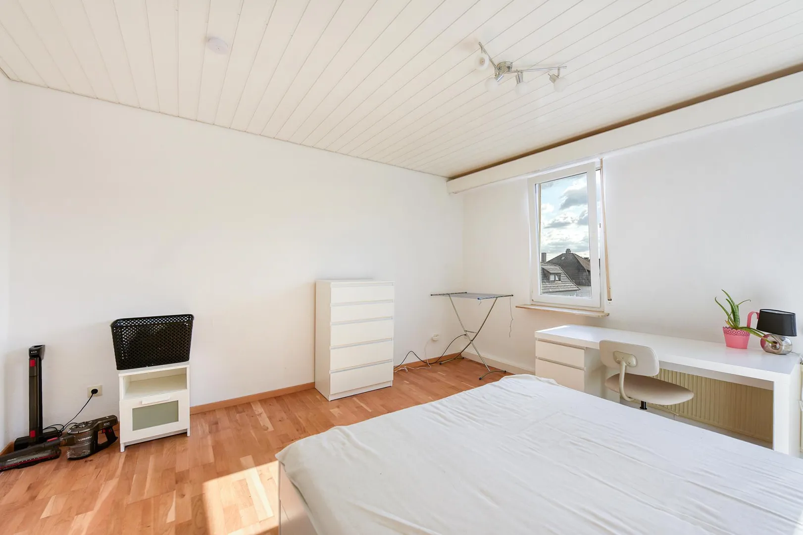 Das Zimmer ist ausgestattet mit einem Parkett-Boden, Kunststofffenstern von 1998 mit Rollläden, Raufasertapeten sowie weißen Holz-Decken-Paneelen.