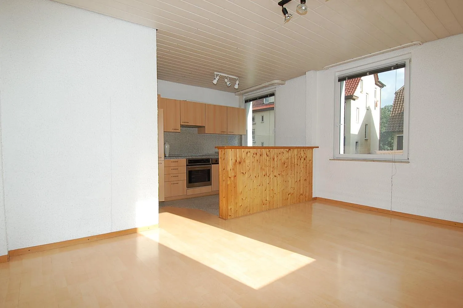 Im Wohnzimmer befindet sich eine offene Einbauküche. Die Einbauküche ist ca. 10 Jahre alt und hat neu ca. 4.500 EUR gekostet.