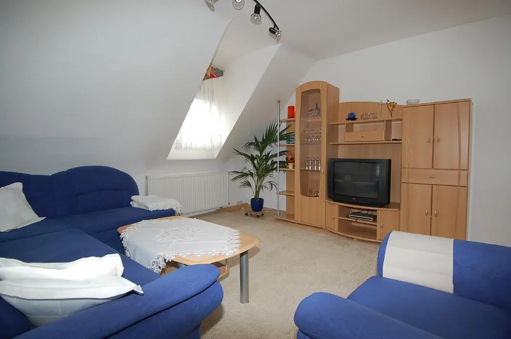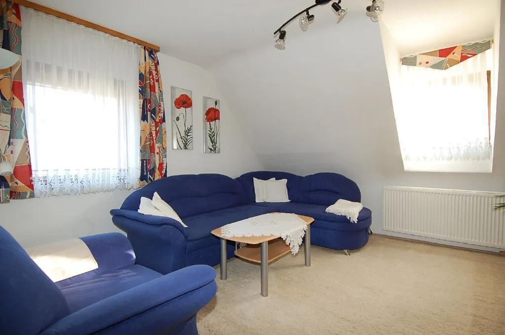 Das Wohnzimmer ist zur Süd-West-Seite ausgerichtet und mit einer Sitzgruppe und einem TV-Schrank mit Fernseher (SAT-Empfang) ausgestattet.