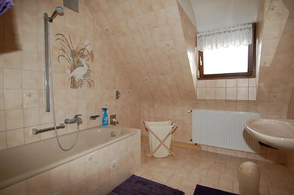 Das geräumige Badezimmer ist raumhoch gefliest und verfügt über Fenster, Badewanne und Waschmaschinenanschluss.