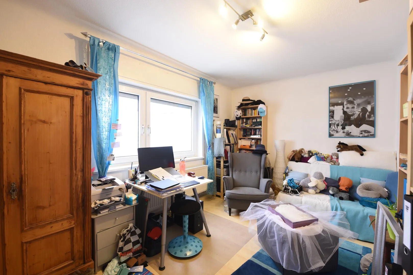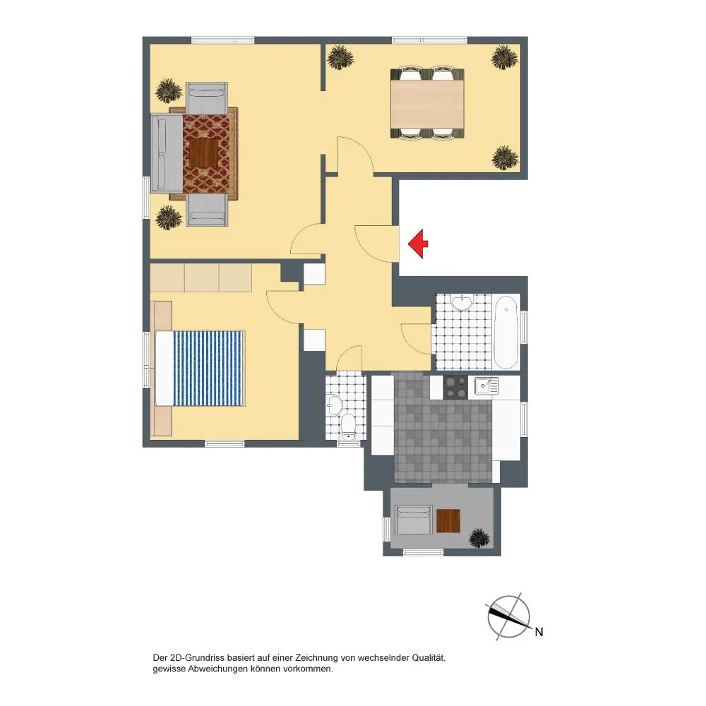 Der Grundriss der Wohnung ist gut. Alle Räume sind direkt vom Flur begehbar. Das Badezimmer sowie das separate WC verfügen über ein Fenster. Über die Küche ist die Veranda begehbar. Vom Wohnbereich zum Arbeits-/Essbereich gibt es einen offenen Durchgang.