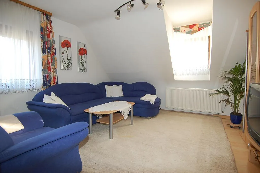 Das Wohnzimmer ist zur Süd-West-Seite ausgerichtet und mit einer Sitzgruppe und einem TV-Schrank mit Fernseher (SAT-Empfang) ausgestattet.