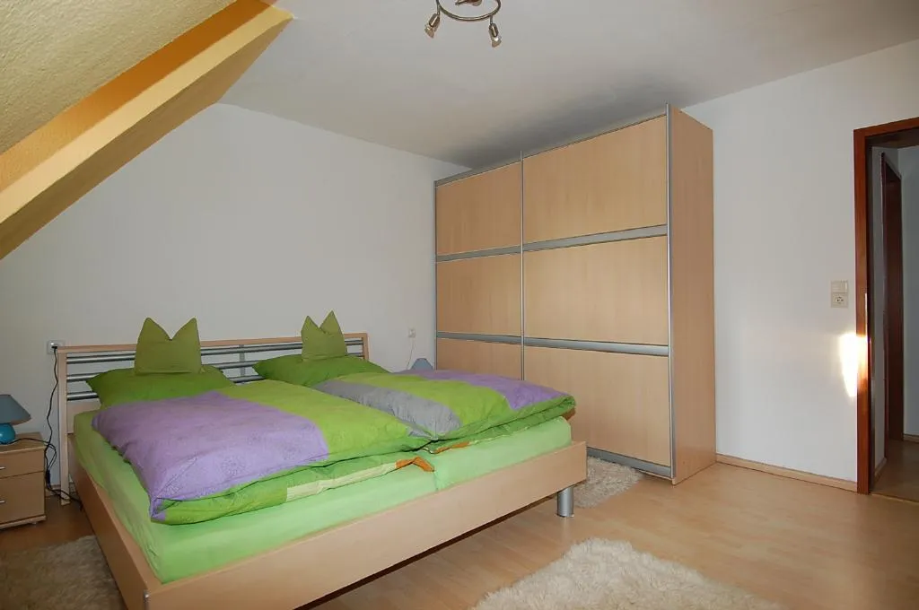 Das Schlafzimmer verfügt über ein großzügiges Doppelbett und einen geräumigen Kleiderschrank.