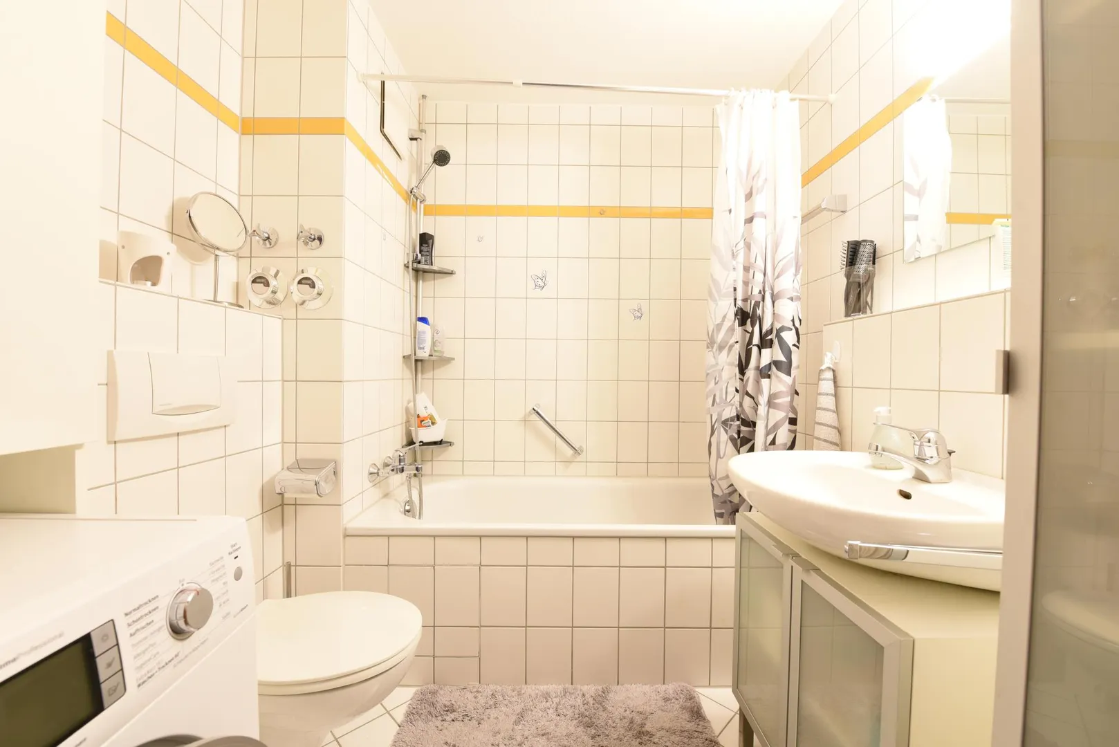 Das raumhoch geflieste Badezimmer ist ausgestattet mit einer Badewanne, einem WC sowie einem Waschmaschinenanschluss.