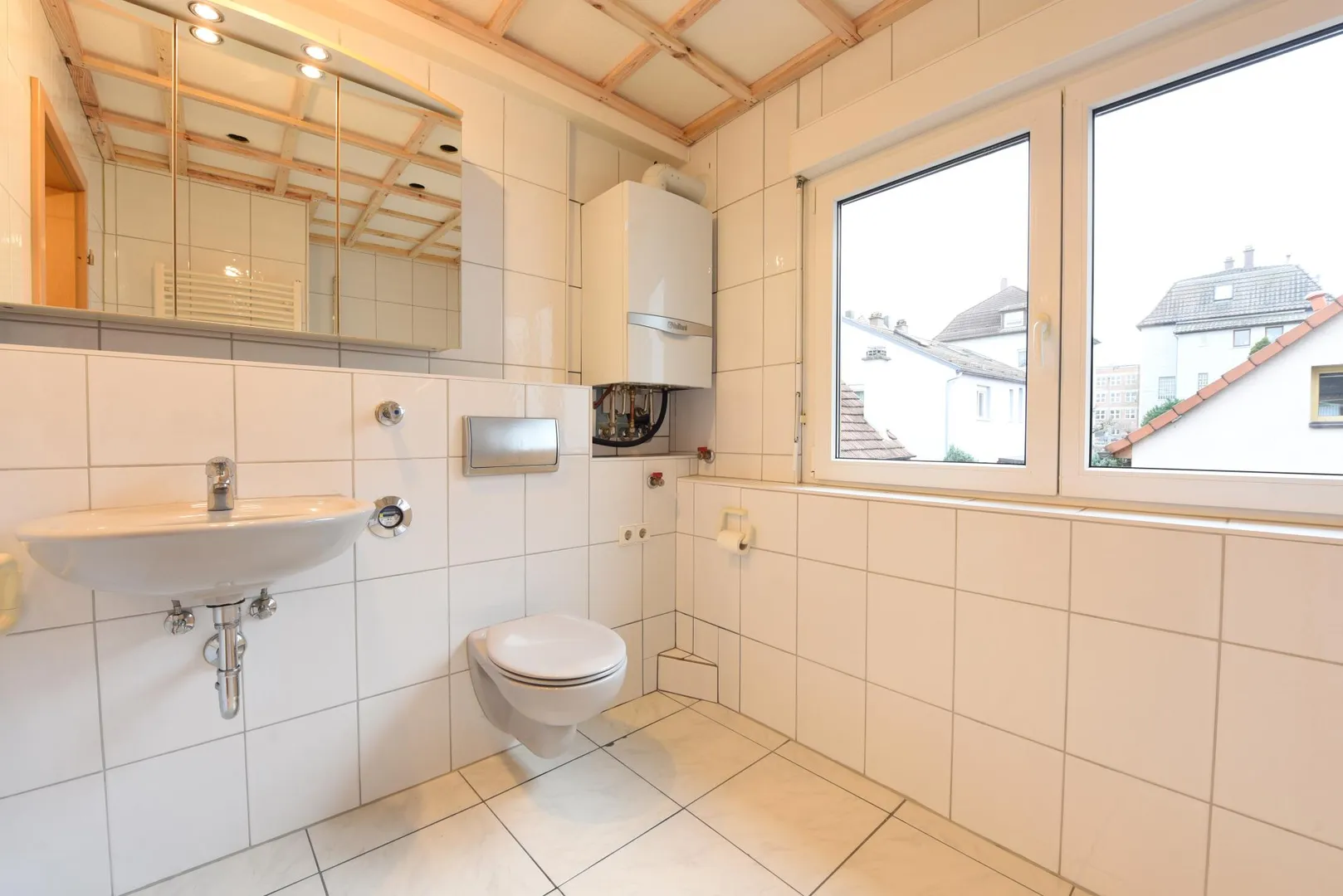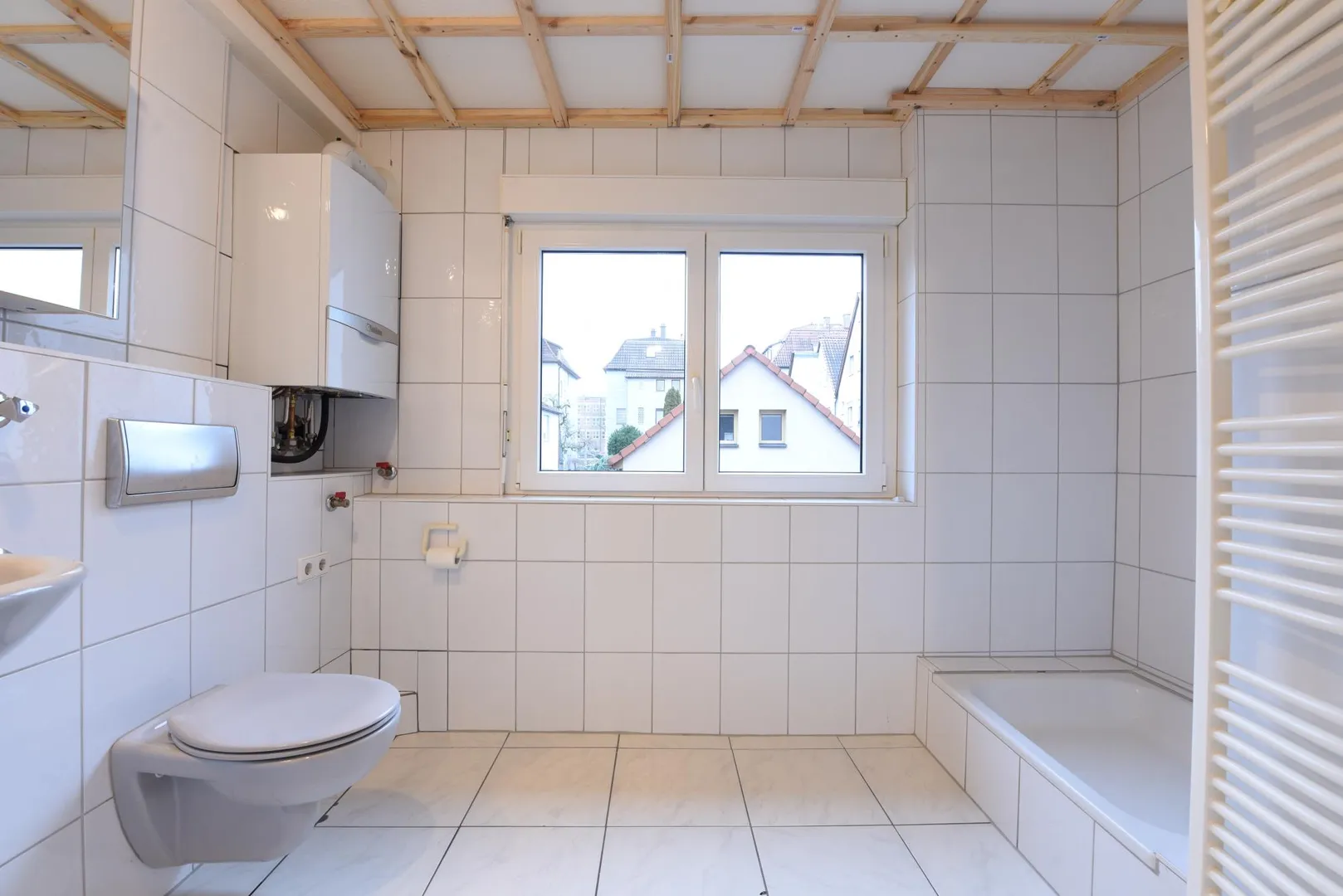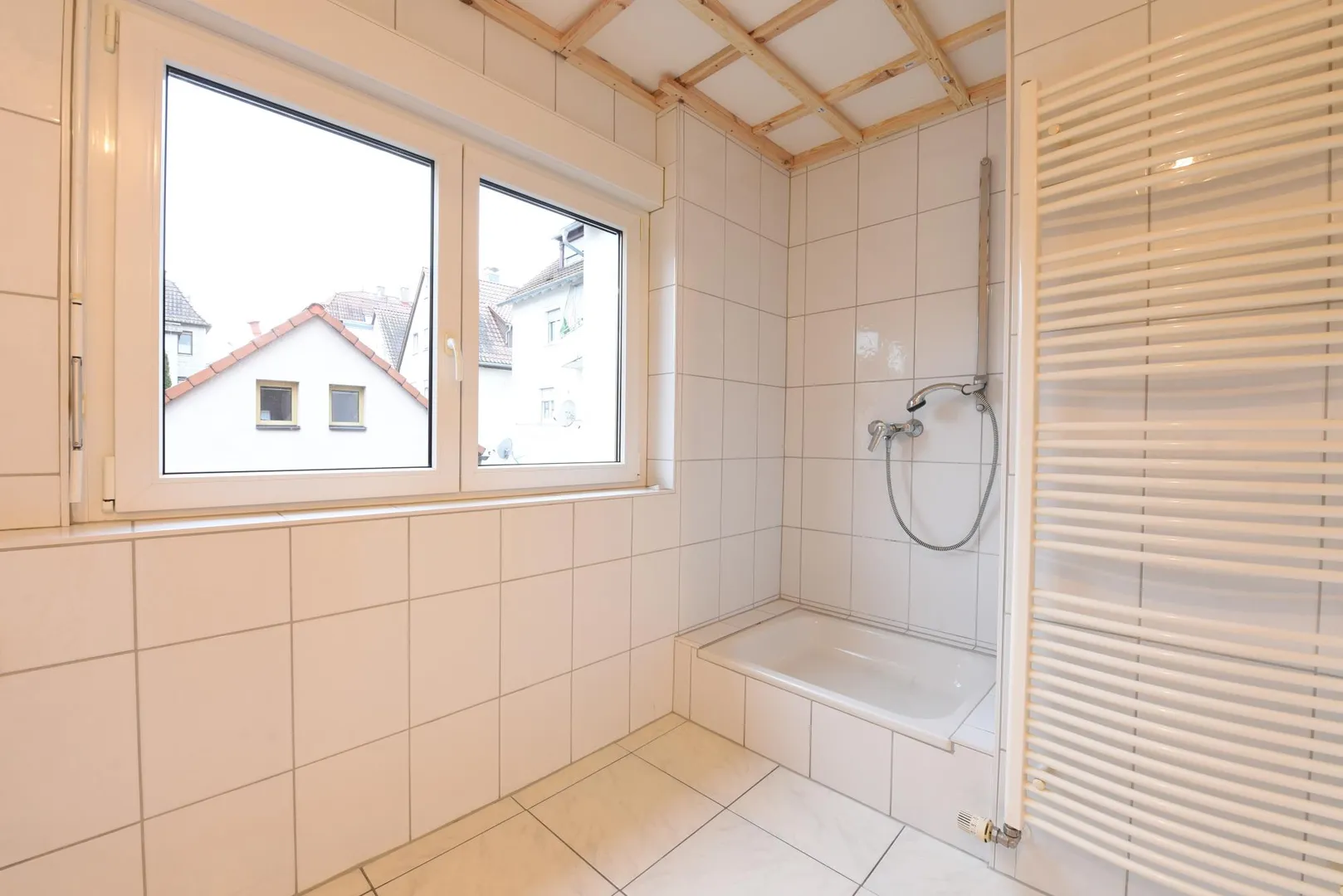 Das raumhoch geflieste Badezimmer mit Fenster wurde vor ca. 10 Jahren erneuert. Es ist ausgestattet mit einer Dusche, einem WC, einem Handtuch-Heizkörper sowie einem Spiegelschrank. Das Badezimmer ist über die Küche begehbar.