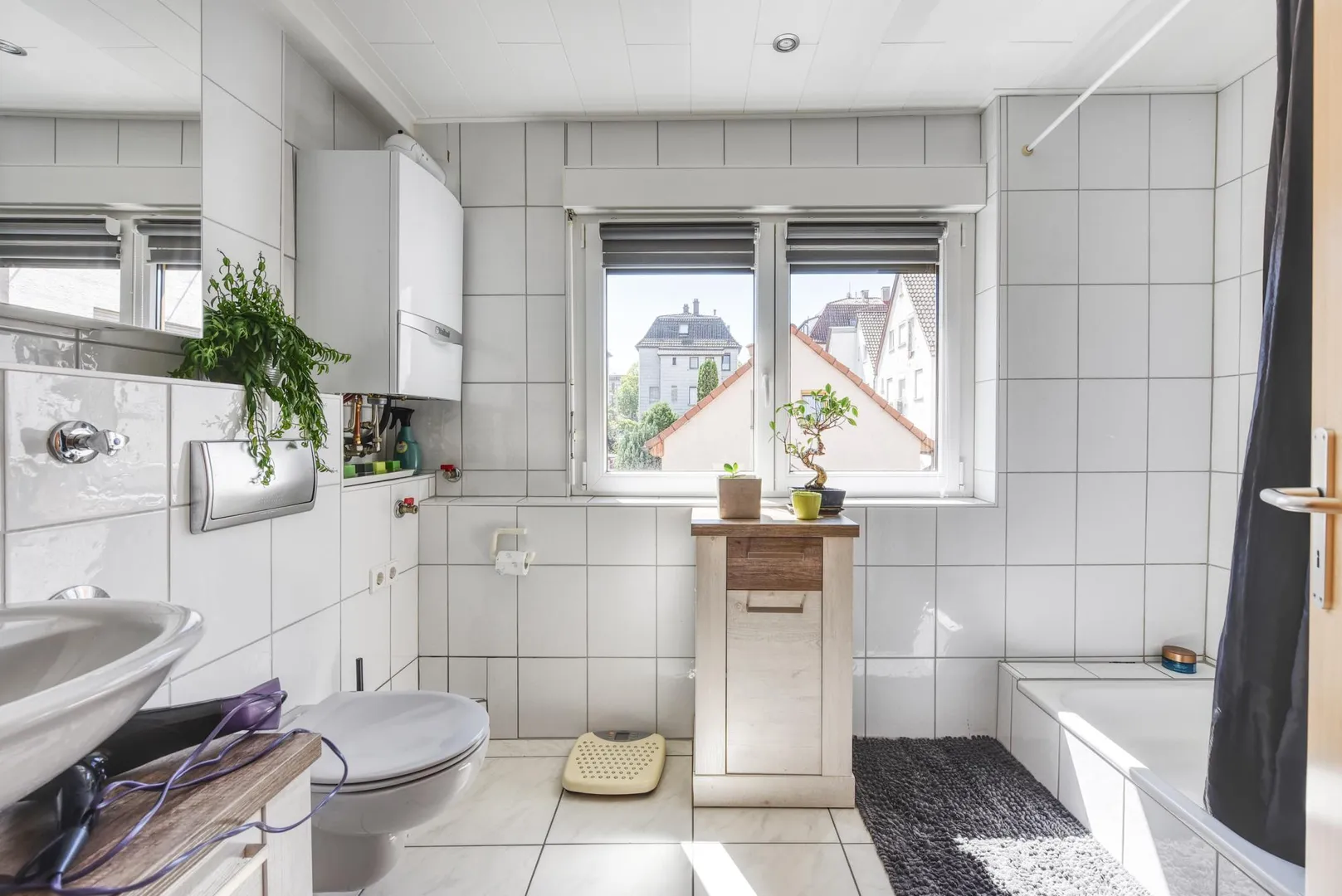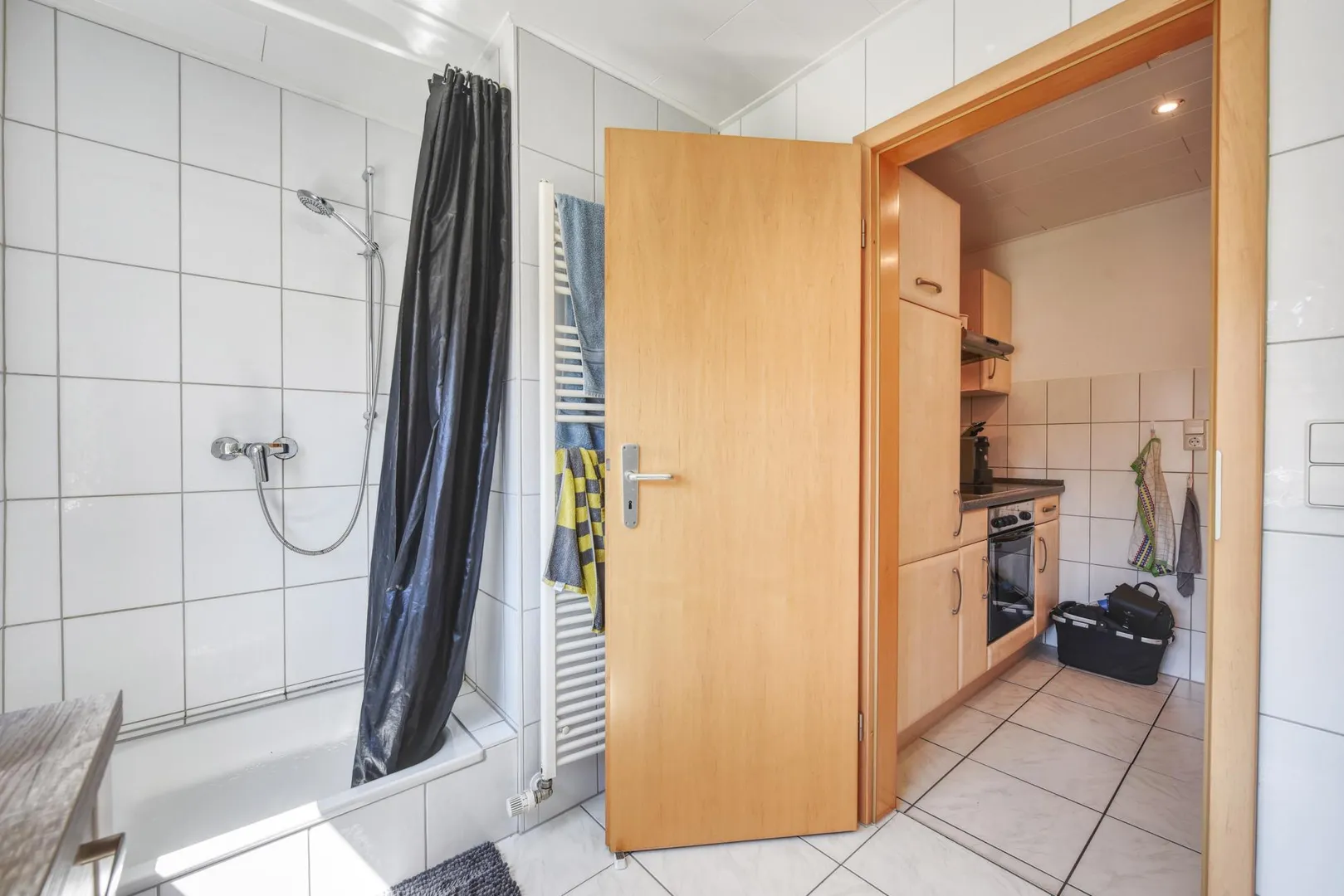 Das raumhoch geflieste Badezimmer mit Fenster wurde vor ca. 10 Jahren erneuert. Es ist ausgestattet mit einer Dusche, einem WC, einem Handtuch-Heizkörper sowie einem Spiegelschrank. Das Badezimmer ist über die Küche begehbar.