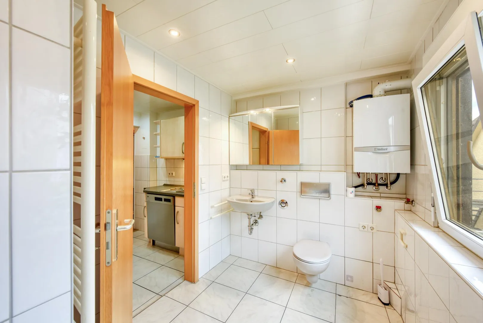 Das raumhoch geflieste Badezimmer mit Fenster wurde ca. 2010 modernisiert. Es ist ausgestattet mit einer Dusche, einem WC, einem Handtuch-Heizkörper sowie einem Spiegelschrank. Das Badezimmer ist über die Küche begehbar.