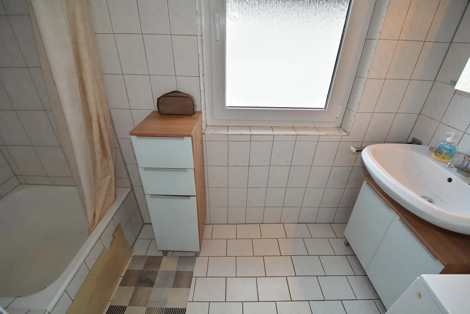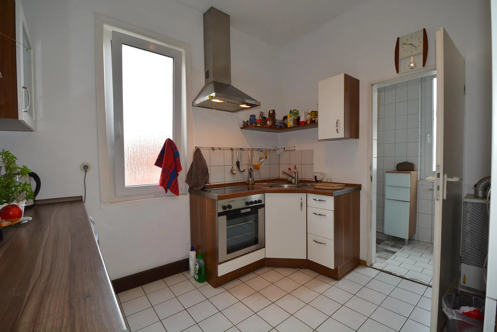 Das modernisierte Badezimmer ist über die Küche begehbar, ist raumhoch gefliest und ist mit einer Dusche sowie einem Fliesenboden ausgestattet.