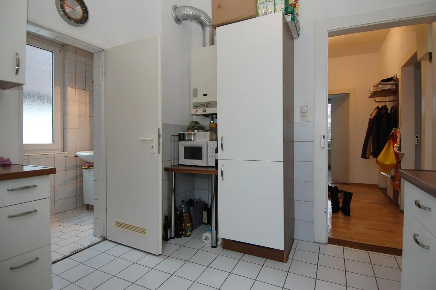 Die Küche ist mit einem Fliesenboden und einem Waschmaschinenanschluss ausgestattet.