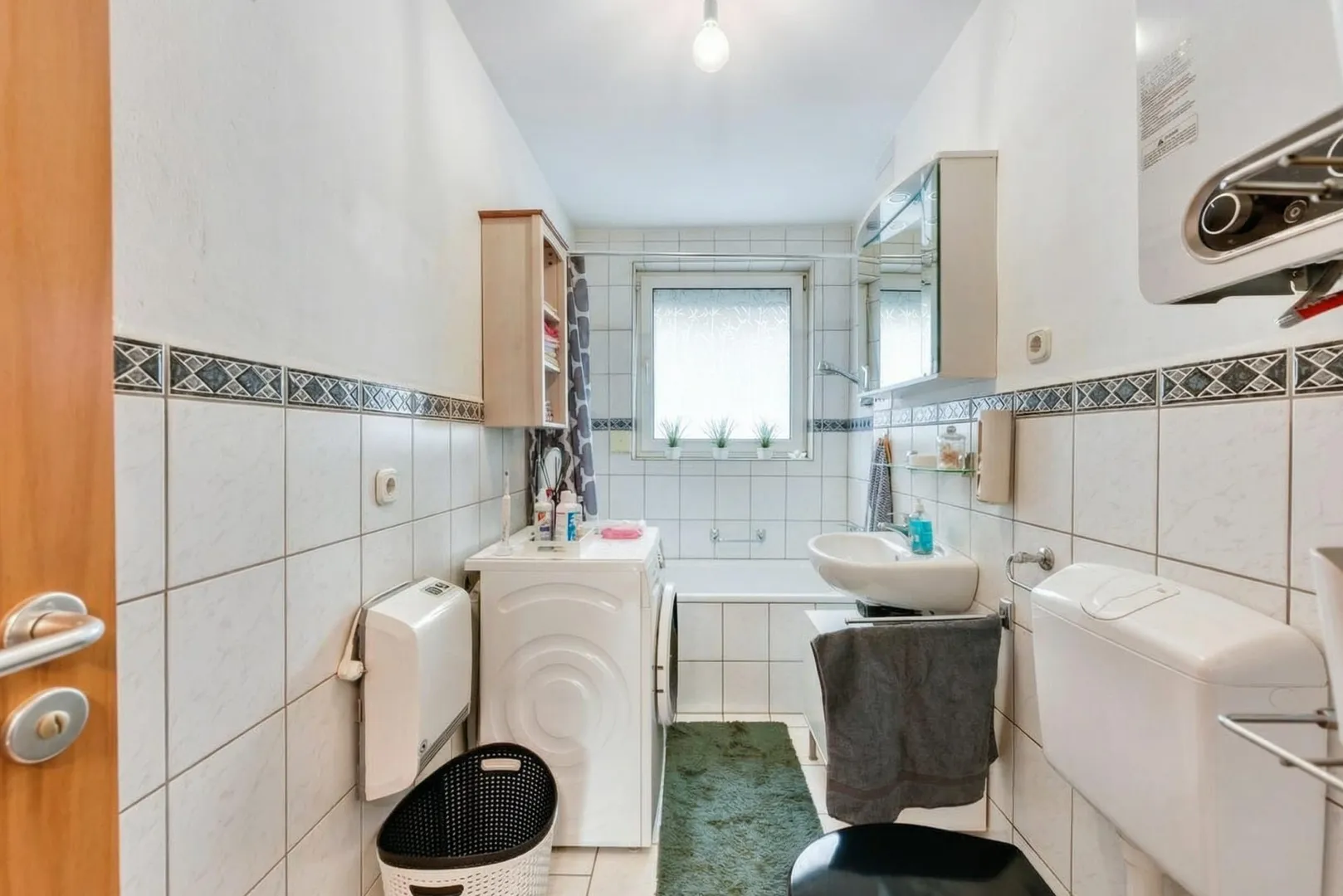 Das teilweise raumhoch geflieste Badezimmer mit Fenster ist ausgestattet mit einem Fliesenboden, einer Badewanne, einem WC, einem Waschmaschinen-Anschluss sowie einem Warmwasser-Durchlauferhitzer.