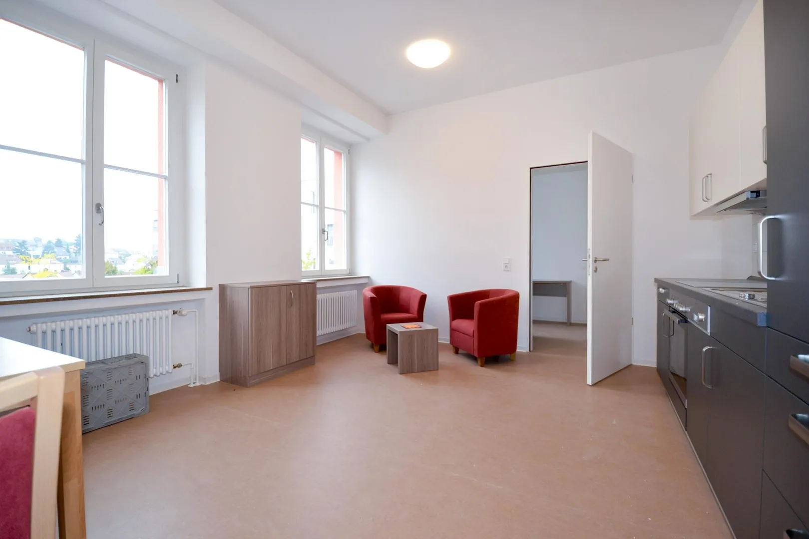 Diese voll möblierte, neuwertige und bequeme 2-Zimmer-Wohnung befindet sich im 2. Obergeschoss eines freistehenden Mehrgenerationenhauses mit 29 Wohneinheiten.
