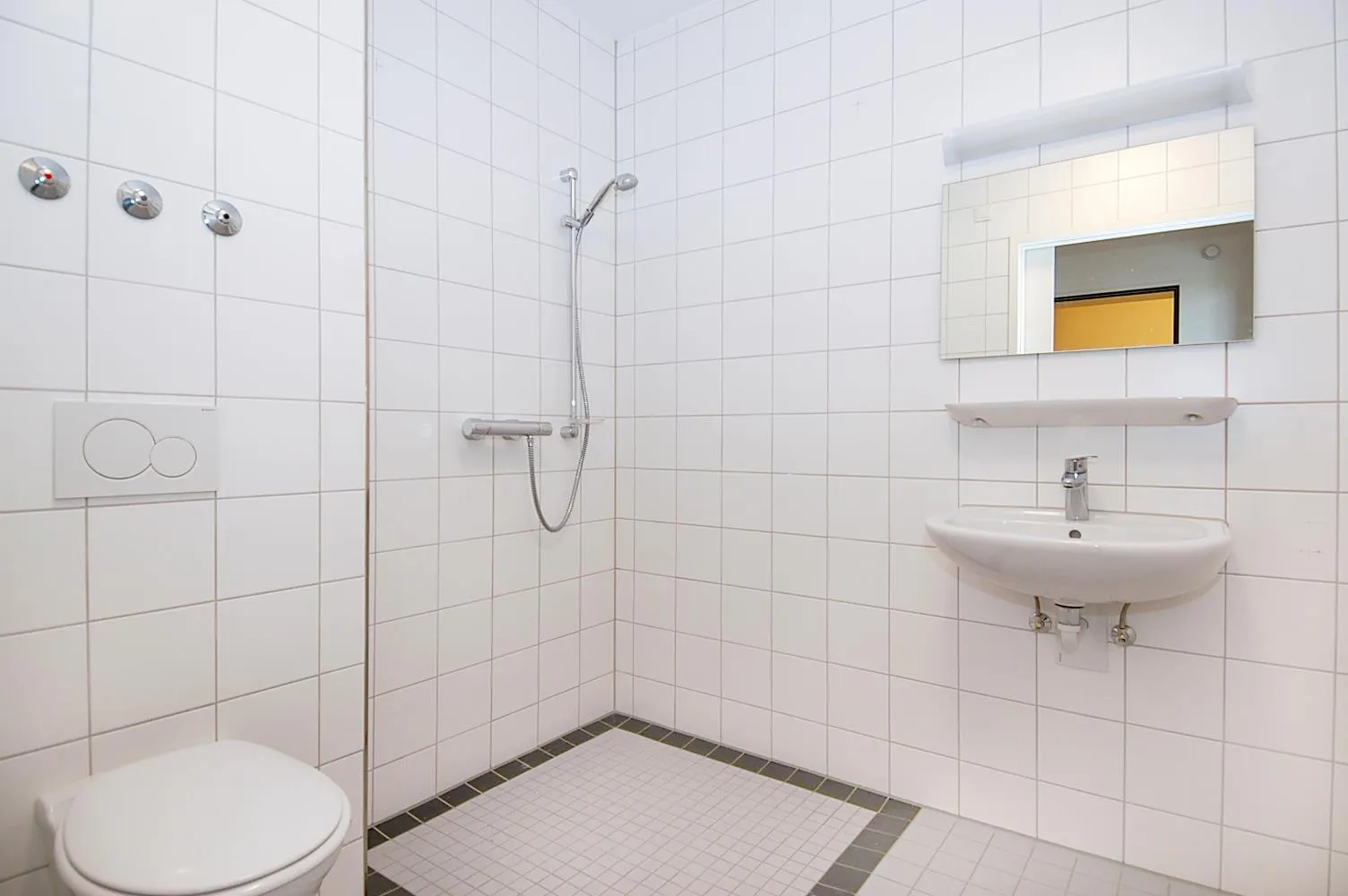Das raumhoch geflieste Badezimmer verfügt über einen Fliesenboden, eine bodentiefe Dusche, ein Waschbecken sowie ein WC.
