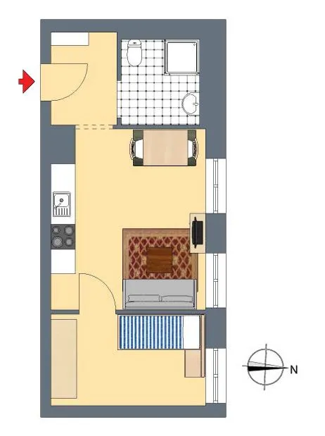Im Flur befindet sich eine Garderobe. Im Schlafzimmer befinden sich ein Schreibtisch, ein Stuhl, eine Kommode, ein Schrank und ein Bett mit Nachttisch. Im Wohnzimmer befinden sich ein Tisch, zwei Stühle, eine Kommode und zwei Sessel.