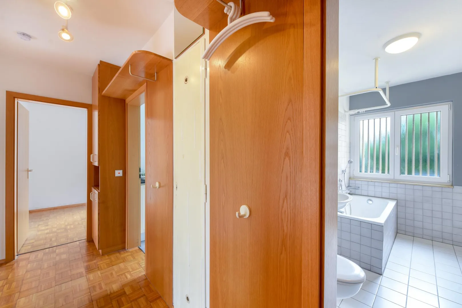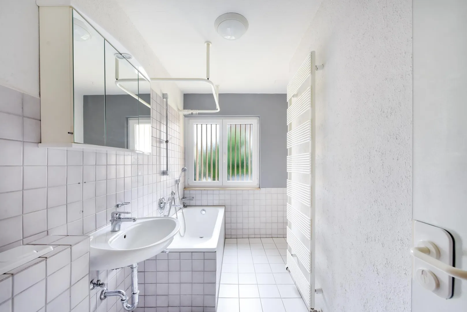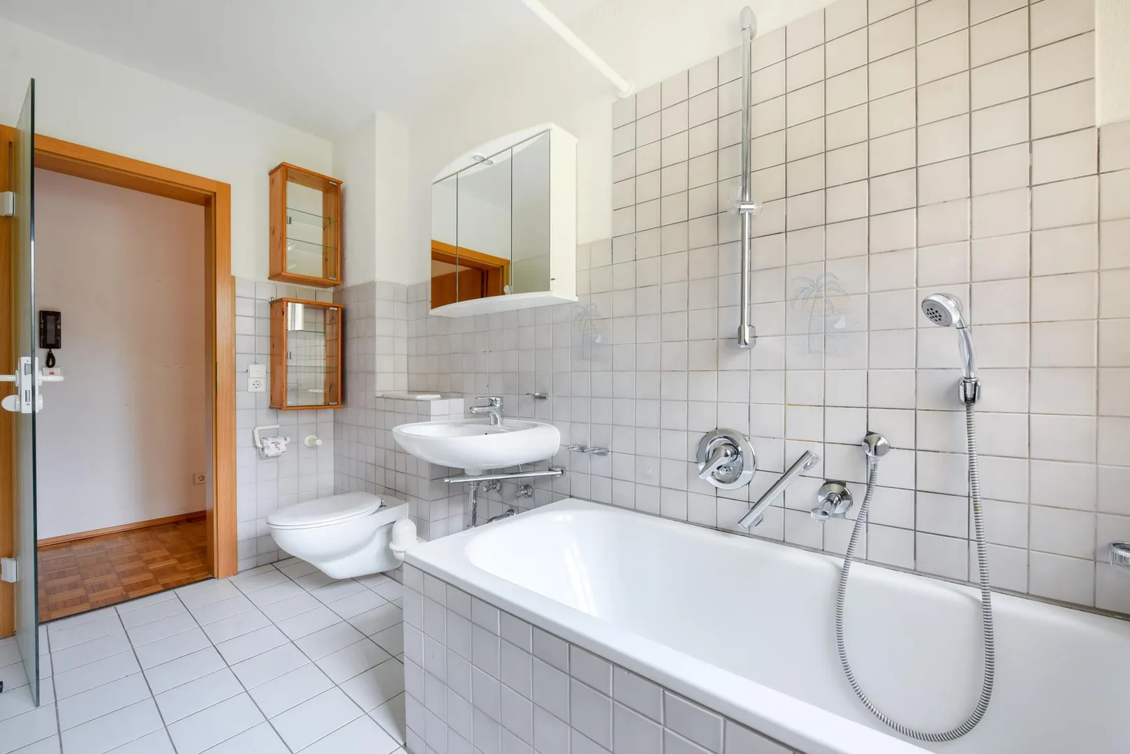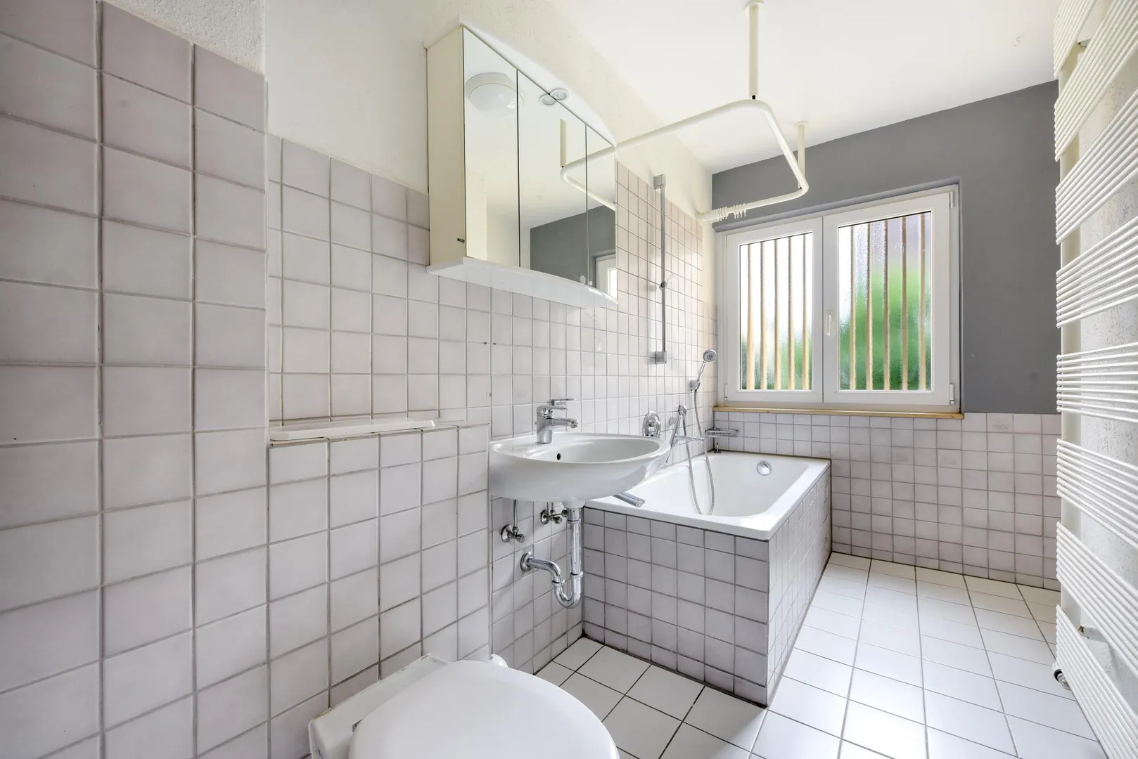 Das teilweise geflieste Badezimmer ist ausgestattet mit einer Badewanne, einem WC sowie einem Handtuch-Heizkörper und wurde in den 90-er Jahren modernisiert.