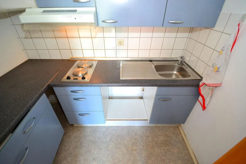 Die Küche ist ausgestattet mit einem Linoleumboden und einer Einbauküche. Die Einbauküche beinhaltet 2 Kochplatten, einen Dunstabzug, einen Kühlschrank mit Gefrierfach, eine Spülmaschinenplatz sowie Unter- und Oberschränke.