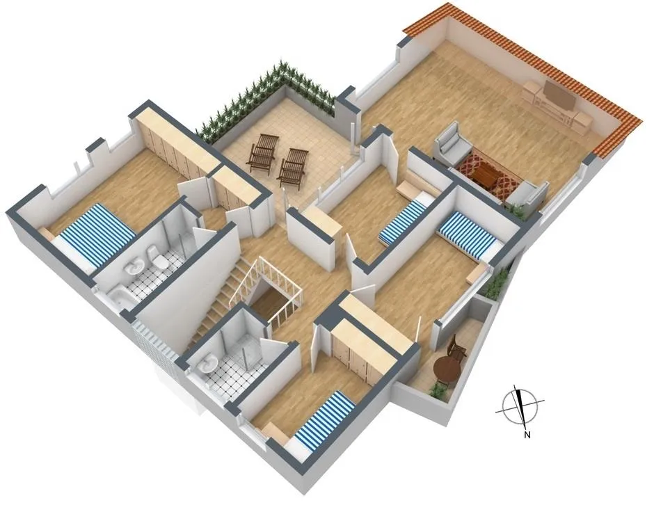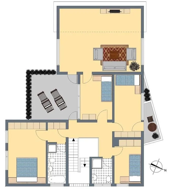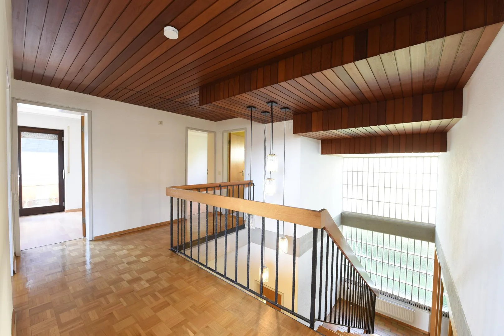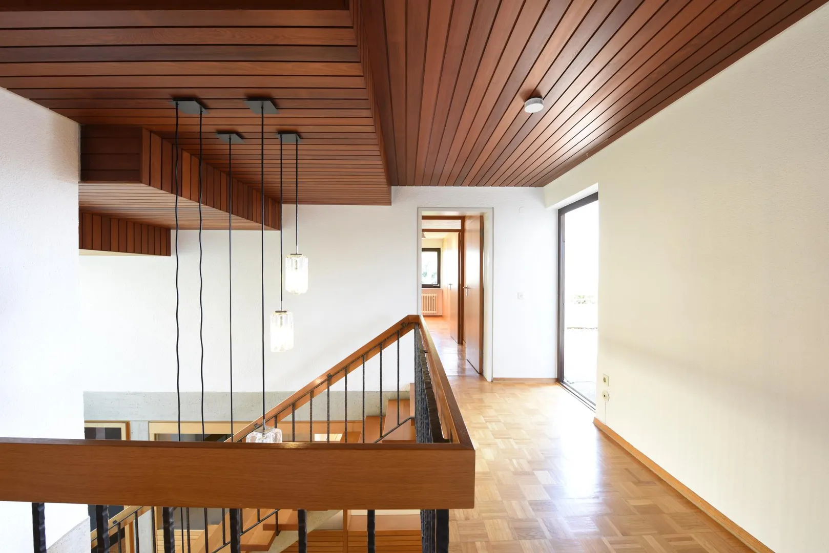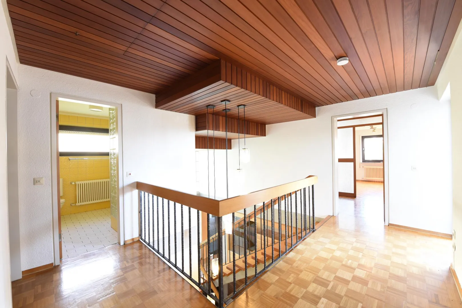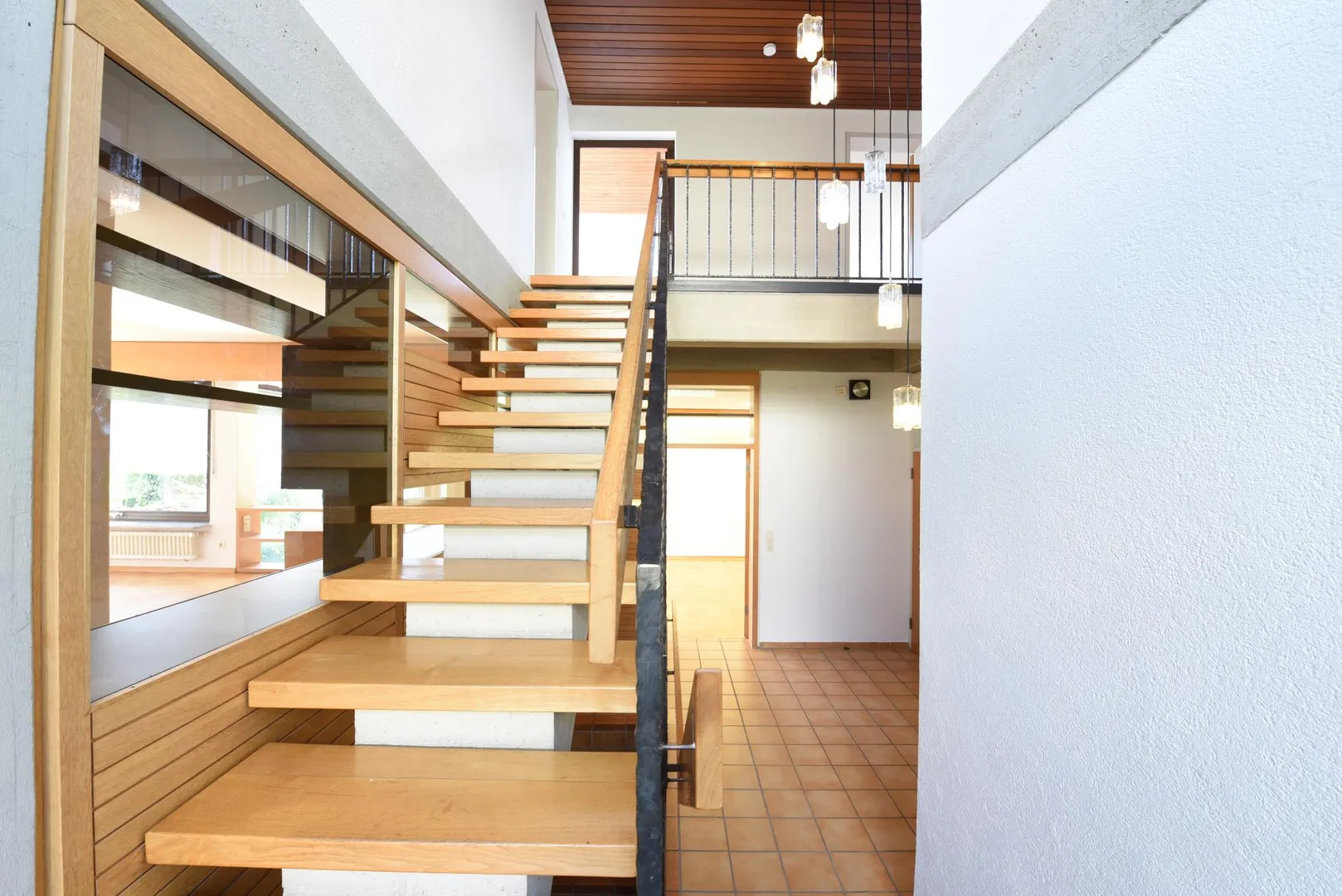 Im Obergeschoss befinden sich 5 Zimmer, eine Terrasse und zwei Bäder.