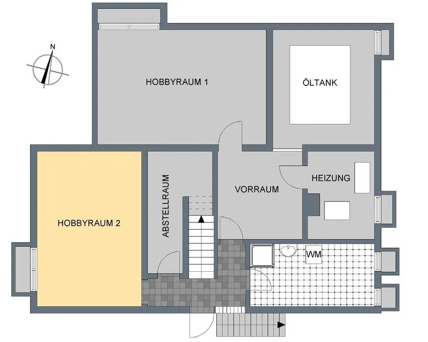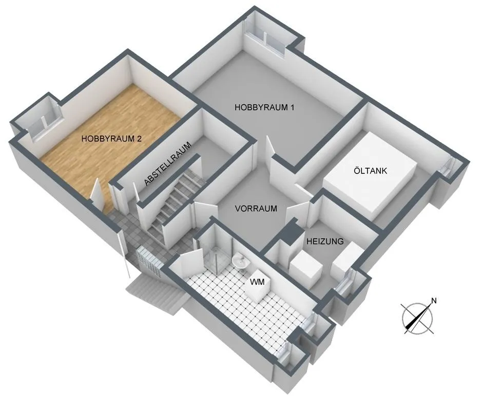 Im Untergeschoss befinden sich zwei Hobbyräume, ein Waschraum, ein Abstellraum, ein Heizraum und der Öltank.