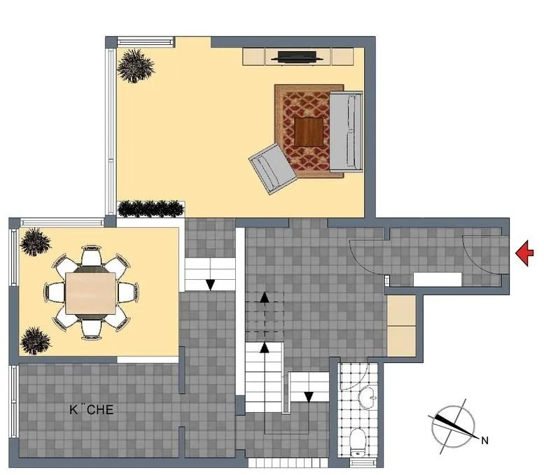 Im Erdgeschoss befinden sich der Eingangsbereich, der Wohnbereich, der Essbereich, die Küche und ein separates WC.