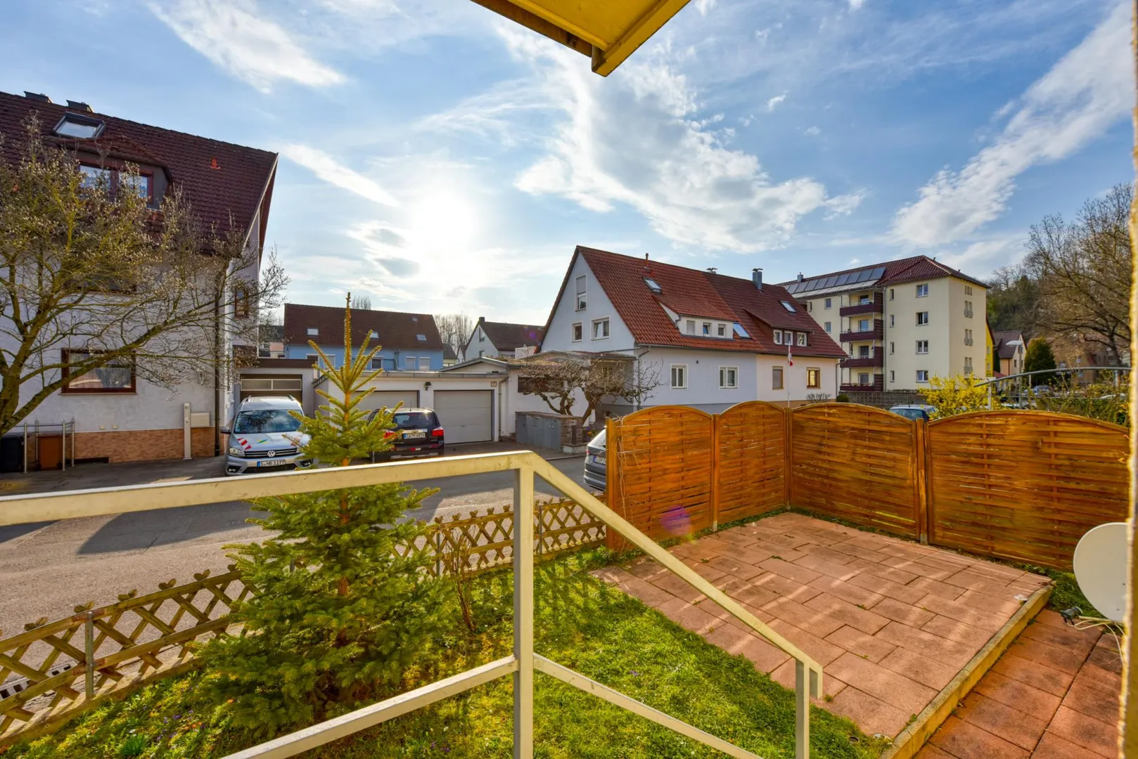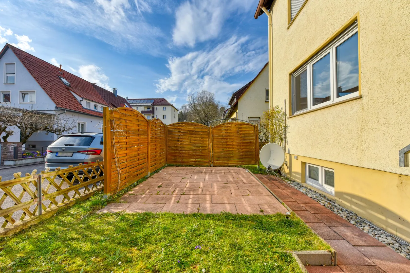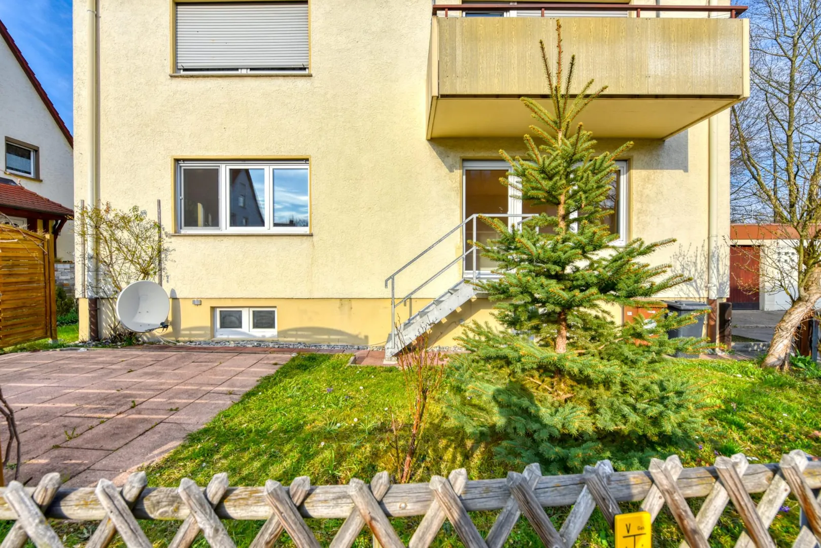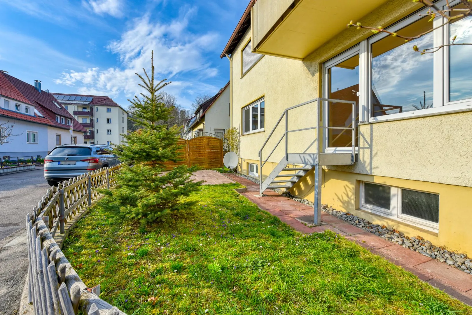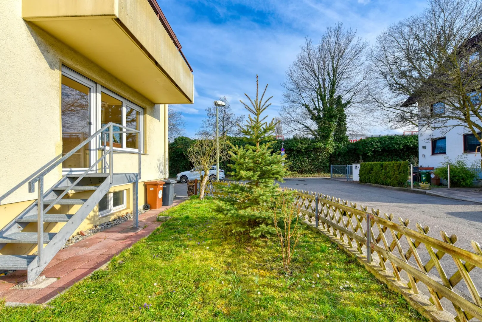 Das Grundstück ist 468 m² groß und eben. Der Grundstücksteil auf der Süd/West-Hausseite gehört zu dieser Wohnung, der Grundstücksteil auf der Nord/Ost-Hausseite gehört zu der Wohnung im Obergeschoss (Sondernutzungsrechte).
