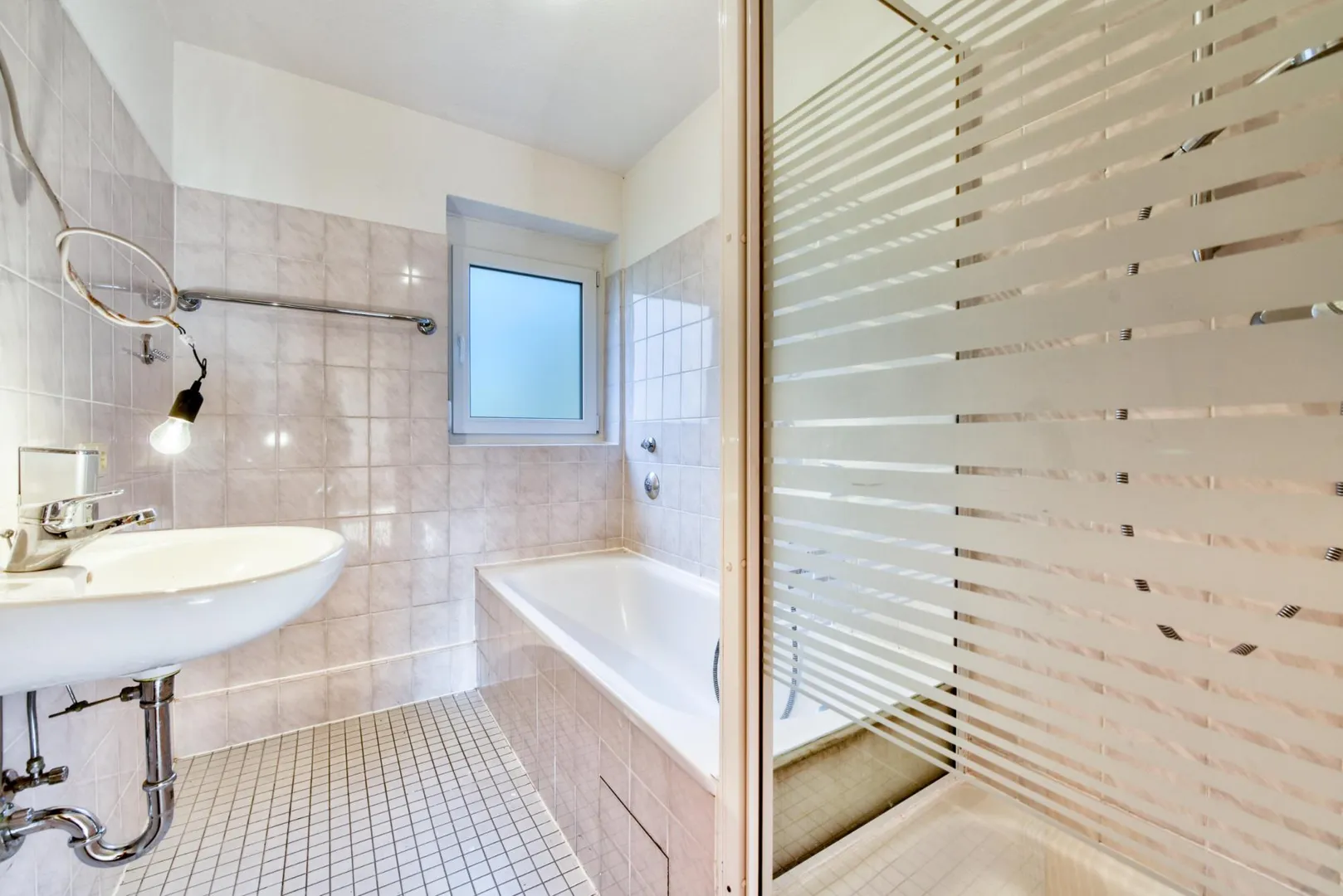 Das 2/3-hoch geflieste Badezimmer mit Fenster ist ausgestattet mit einem Fliesenboden, einer Badewanne sowie einer Dusche.