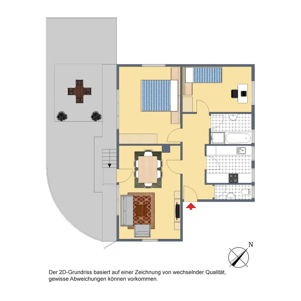 Das Wohnzimmer, das Schlafzimmer, die Terrasse sowie die Grünfläche sind nach Süd-Westen ausgerichtet. Die Terrasse ist über einen Treppenabgang vom Wohnzimmer begehbar.