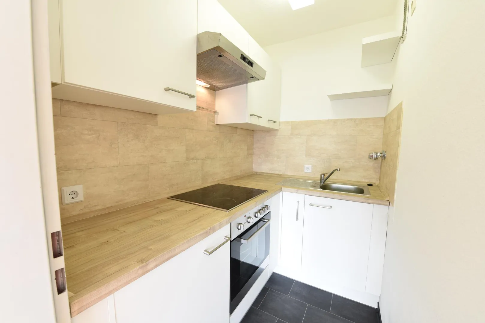 Die Böden in der Küche und im Badezimmer sind gefliest.