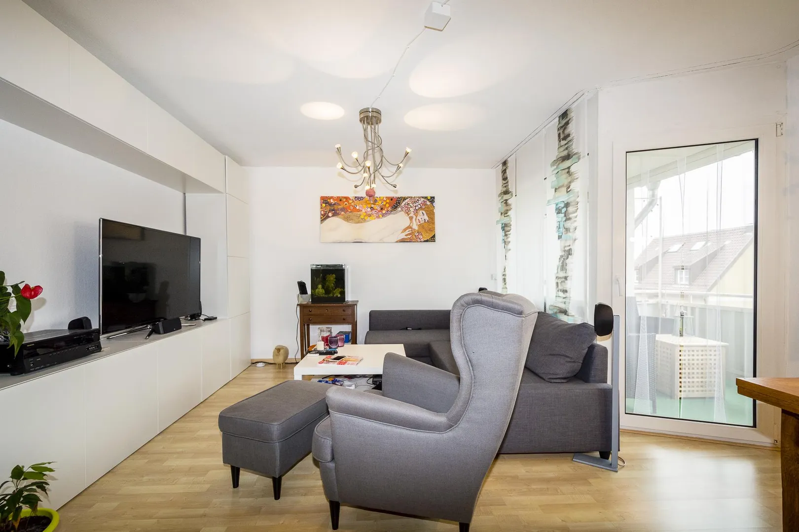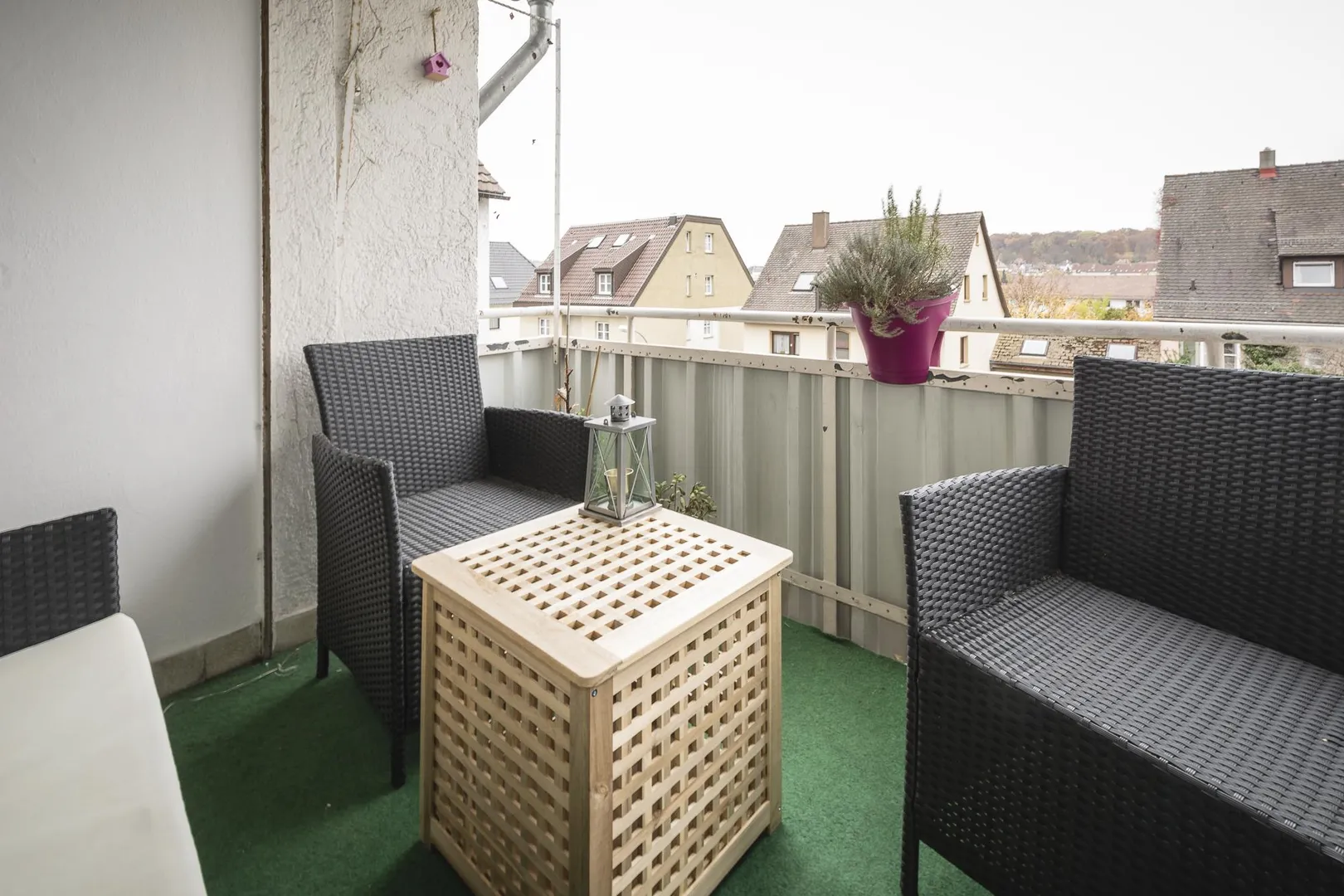 Der ca. 5 m² große und überdachte Süd-Balkon ist vom Wohnzimmer begehbar.