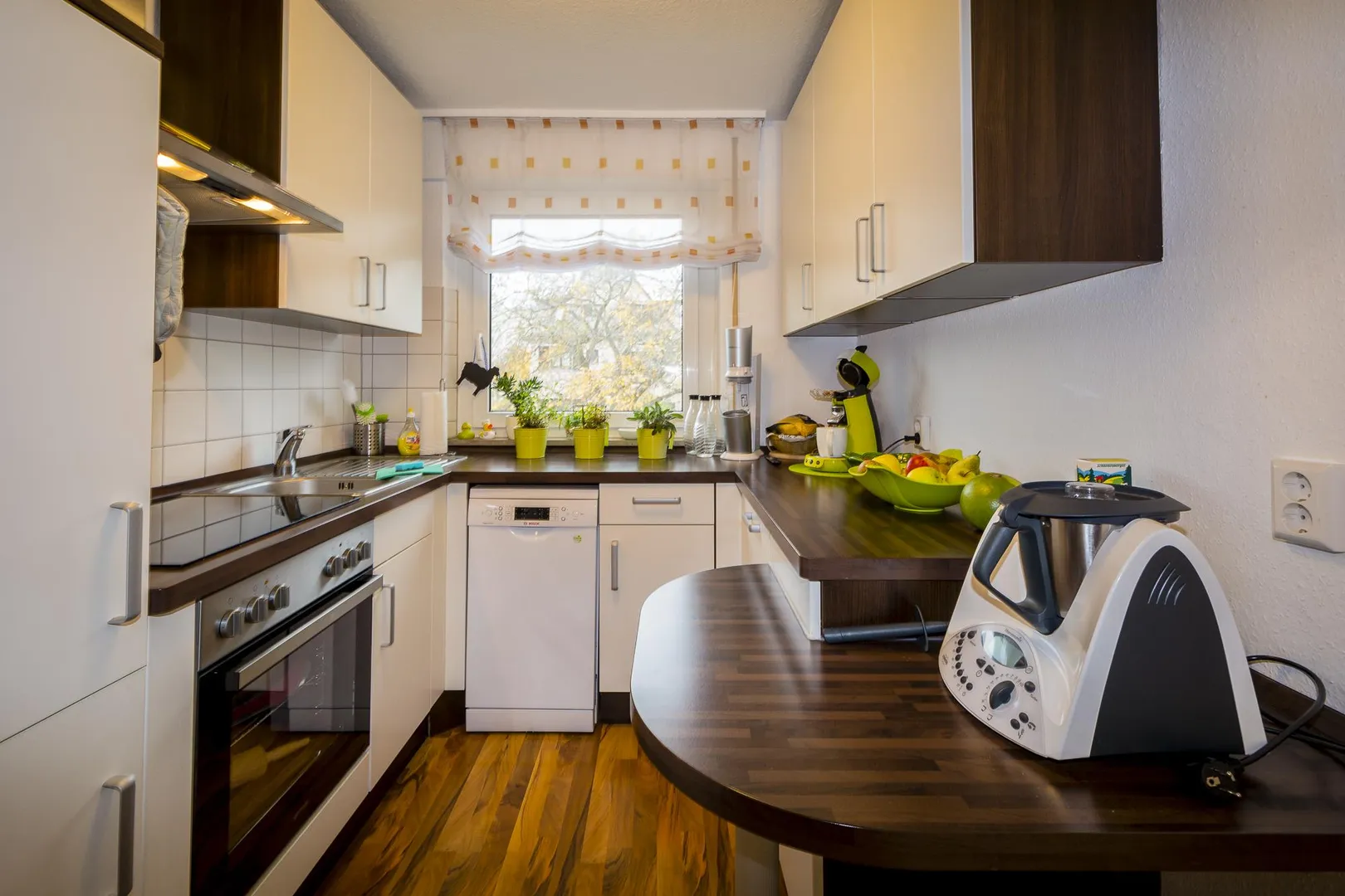 Die Einbauküche ist ausgestattet mit einem Cerankochfeld (von 2015), einem Backofen, einer Geschirrspülmaschine (von 2013), einem Kühlschrank mit Gefrierfach, einem Umluft-Dunstabzug sowie Ober- und Unterschränken.