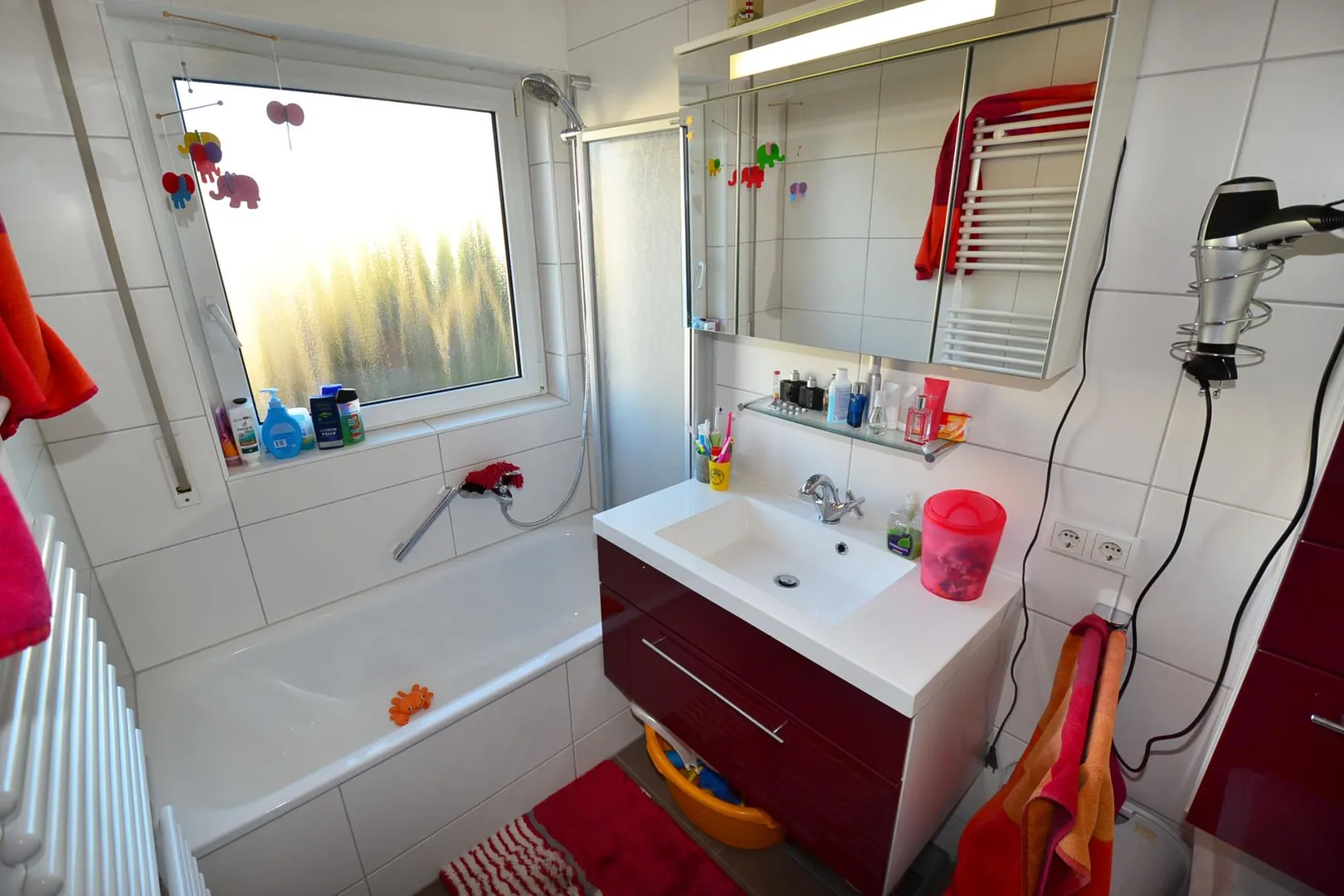 Das raumhoch geflieste Tageslicht-Badezimmer wurde ca. 2007 modernisiert und mit einer Badewanne, einem Waschbecken sowie einem Handtuch-Heizkörper ausgestattet. Ein Waschtischunterschrank, ein Spiegelschrank und ein Hängeschrank (siehe Fotos) können von den aktuellen Mietern übernommen werden.