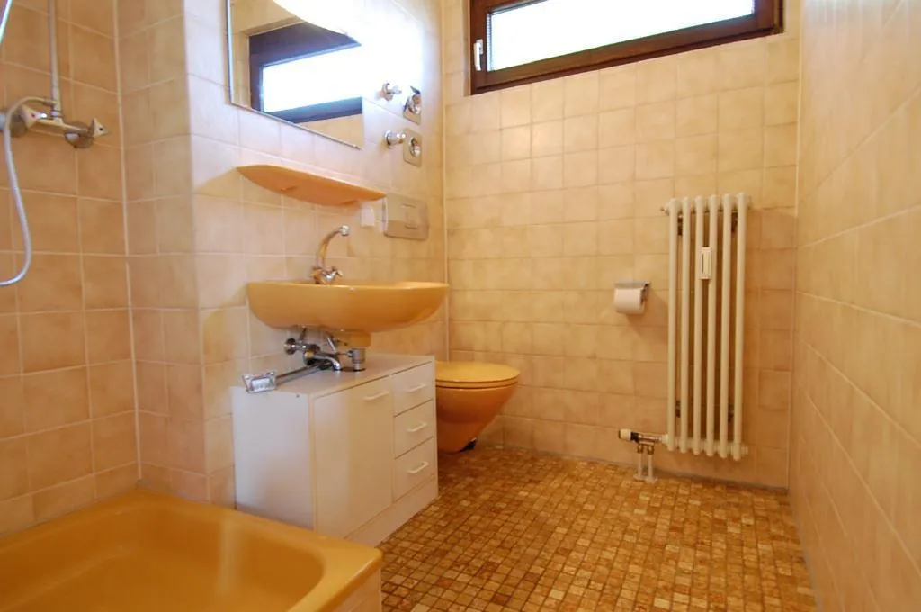 Das Tageslicht-Badezimmer ist raumhoch gefliest und verfügt über einen Fliesenboden, einer Dusche, einen WC und einem Waschmaschinenanschluß.