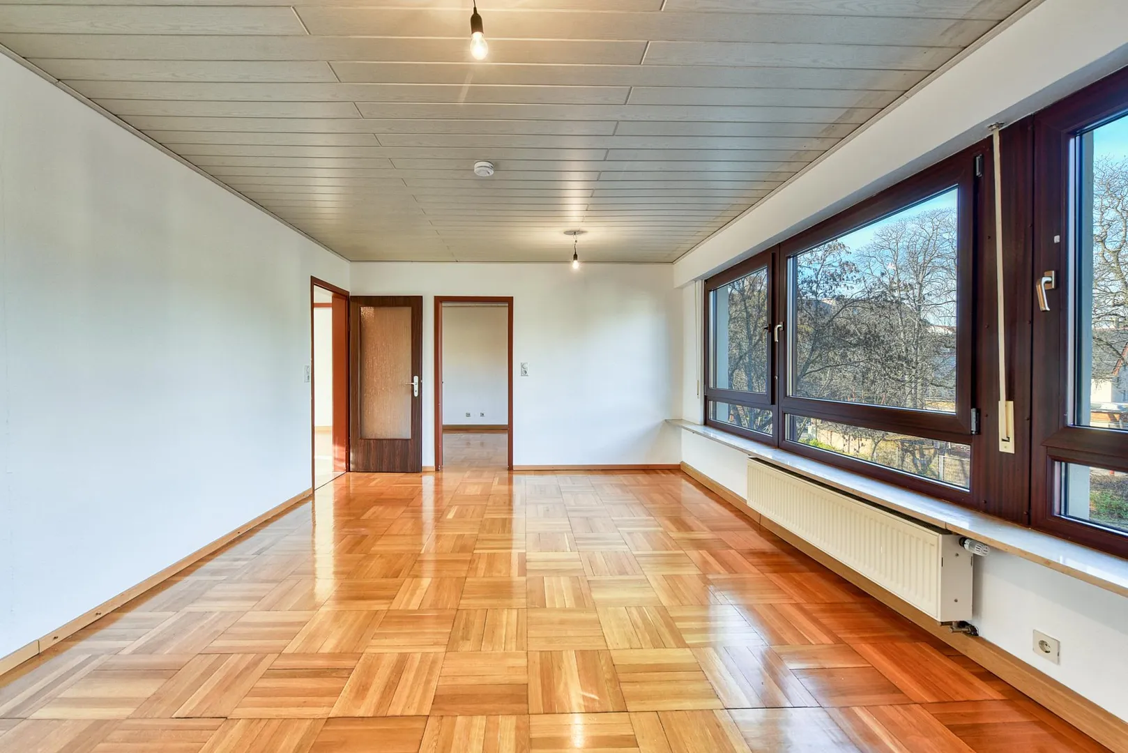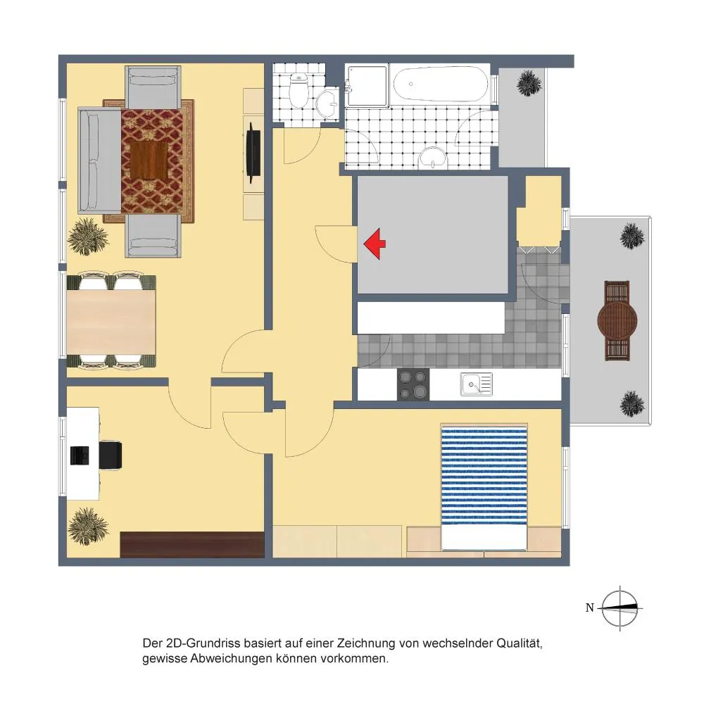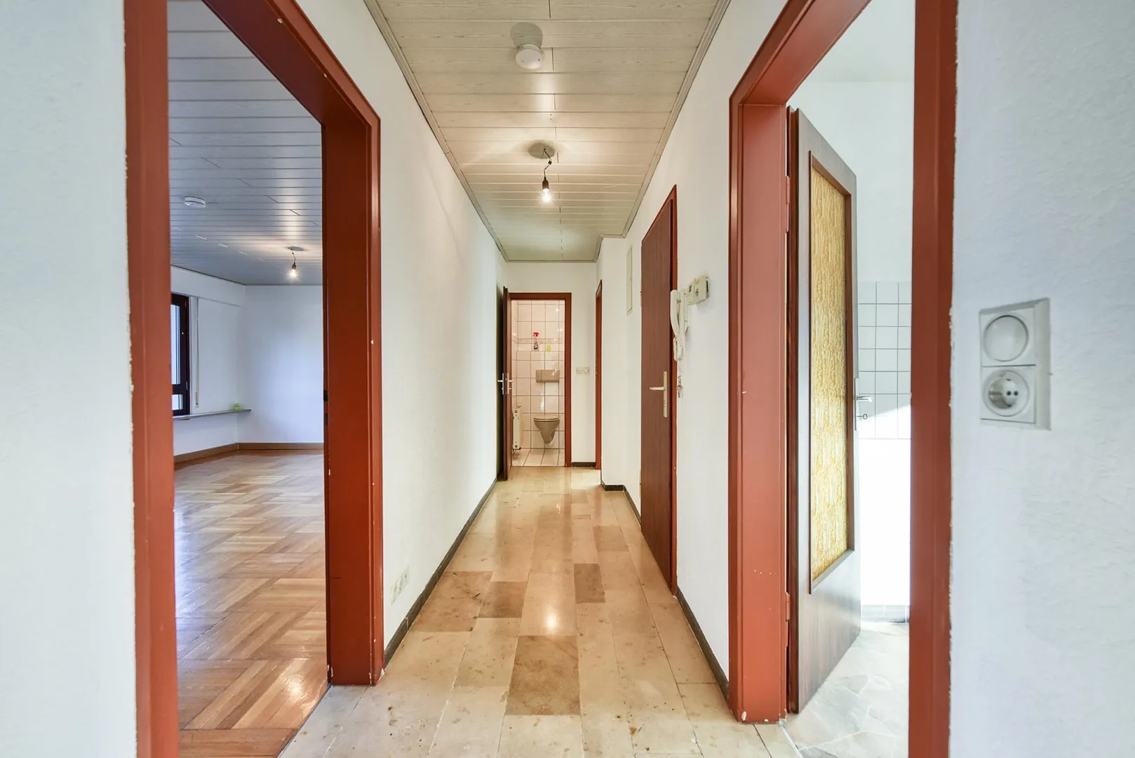 Zwei Zimmer sind über den Flur begehbar. Das Arbeitsimmer ist sowohl über das Wohnzimmer, als auch über das Schlafzimmer begehbar (gefangenes Zimmer). Ein ca. 4 m² großer und überdachter Süd-Balkon (mit Markise) ist über die Küche begehbar. Der zweite ca. 2 m² große und überdachte Süd-Balkon ist über das Badezimmer begehbar. Das geflieste WC ist separat. Hinter der Küche gibt es eine Speisekammer.