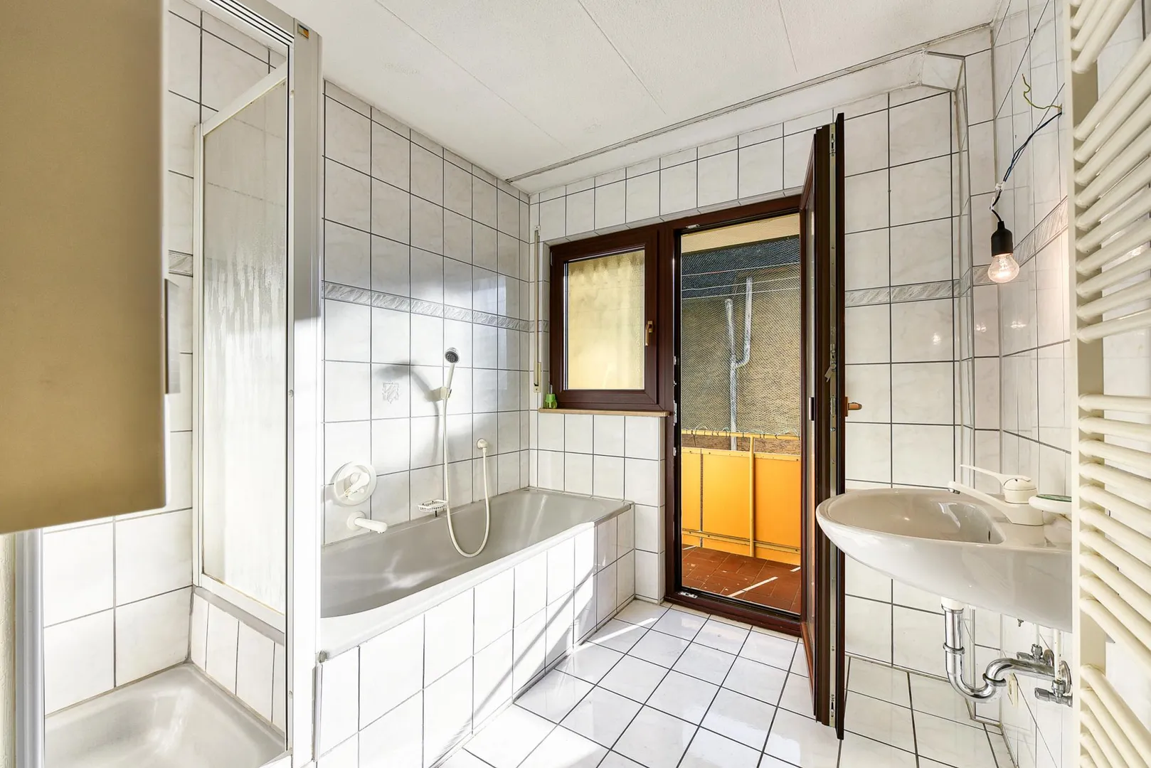 Das raumhoch geflieste Badezimmer mit Balkonzugang ist ausgestattet mit einem Fliesenboden, einer Badewanne, einer Dusche sowie einem Handtuch-Heizkörper.