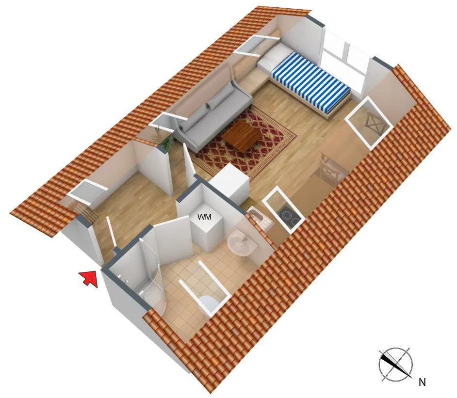 Diese neuwertige und frisch renovierte 1-Zimmer-Dachgeschoss-Pendler-Wohnung befindet sich im 4. Obergeschoss.