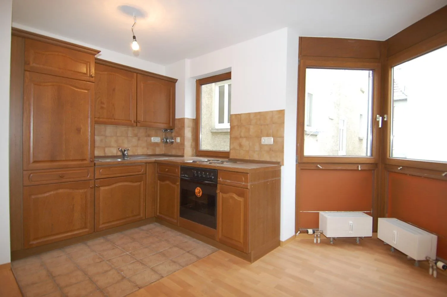 Der Grundriss ist gut. Der Eingangsbereich ist zum Wohnen hin offen. Die Küche ist im Wohnbereich offen integriert und ist mit einer Einbauküche und einem Fliesenboden ausgestattet. Die Einbauküche hat eine dunkelbraune, rustikale Optik. Die E-Geräte sind älter aber funktionsfähig. Für die künftige Funktionsfähigkeit der E-Geräte übernimmt der Vermieter keine Haftung. In der Einbauküche ist keine Spülmaschine enthalten.